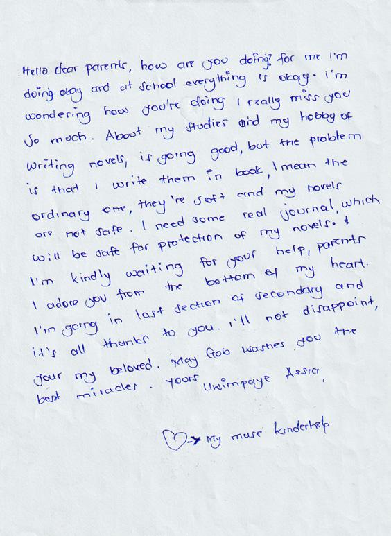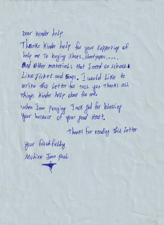 Ik wil deze brief schrijven om jullie te bedanken voor alles wat Kinderhulp voor mij heeft gedaan. Als ik bid, vraag ik God om jullie te zegenen vanwege jullie goede hart. Bedankt voor het lezen van deze brief.