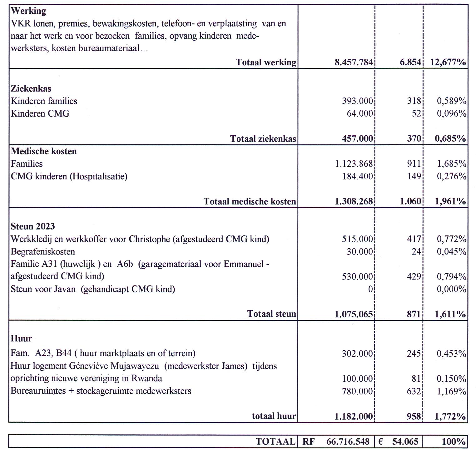 Er is meer uitgegeven voor de werking in Rwanda, maar er was nog een werkingsreserve ter plaatse. We hebben deze opgebruikt gezien de onduidelijke situatie voor de verdere werking van onze vereniging ( zie overzicht op blz. 11-12). Uitgaven werking