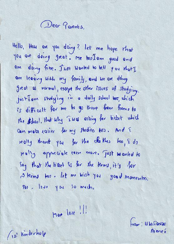Behalve het probleem dat ik heb voor mijn studies. Ik studeer op een reguliere school, wat moeilijk voor me is, omdat ik ver moet, van huis naar school. Daarom vraag ik om een busticket waardoor het makkelijker wordt voor mijn studie. Ook wil ik je echt bedanken voor de kleren.