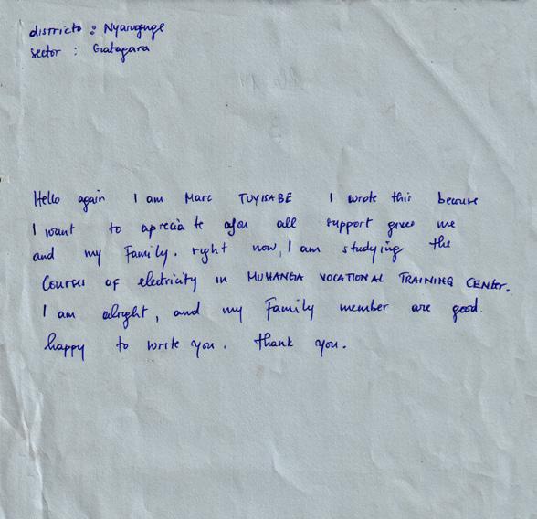 Ik schrijf dit omdat ik jullie wil bedanken voor alle steun die jullie mij en mijn familie geven. Op dit moment studeer ik elektriciteit in het Muhanga Vocational Training Center. Het gaat goed met mij en met mijn familie.