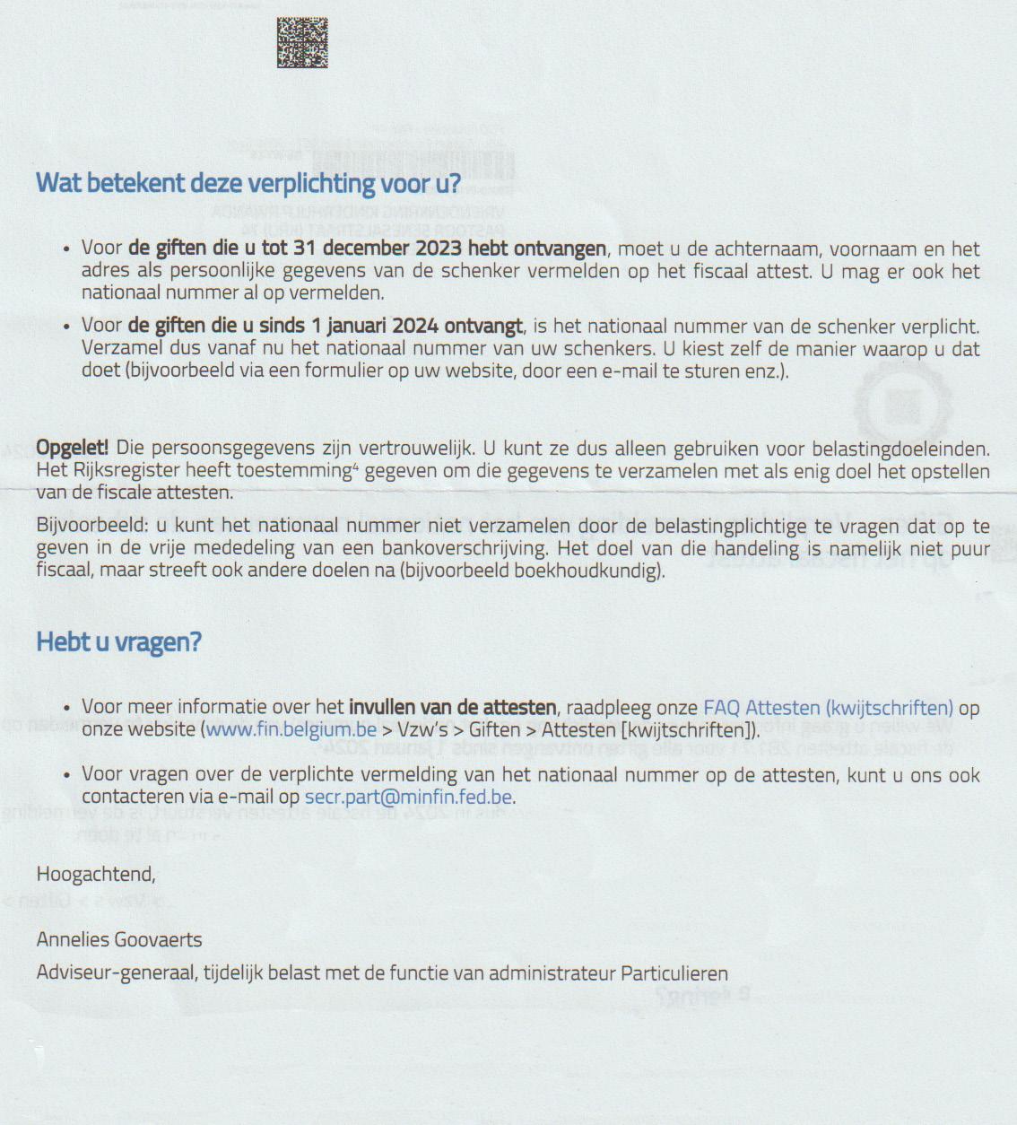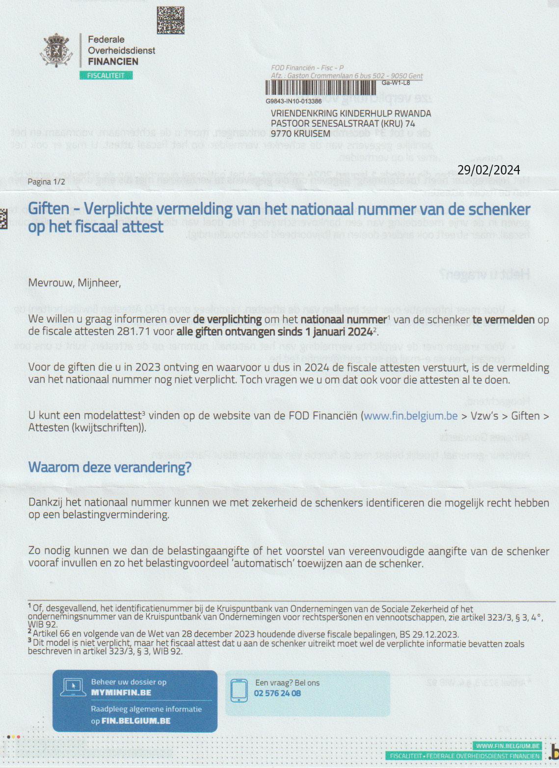 Belangrijk: we kregen een brief met nieuwe richtlijnen voor de opmaak van de fiscale attesten. Men vraagt ons om de nationale nummers van onze sponsors toe te voegen. Voor meer uitleg hierover lees ook blz.6.