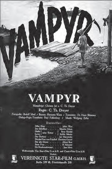 Así, Vampyr (1932) tuvo su versión alemana y fran cesa, y se ubica en medio de la prolífica obra de Dre yer, que comienza hacia 1919 con El Presidente (P ræsi denten) y sigue extendiéndose hasta los años sesenta con muchas más. No hay que olvidar que Europa fue la cuna de la idea del vampiro y del rumor de la pro fanación de tumbas, incipiente en el siglo XVIII con la literatura de castillos, damiselas y hombres solitarios, que evoluciona fuertemente hacia el XIX con la oleada de ocultismo en Crowley, vampirismo, esoterismo y las teorías freudianas del inconsciente, bagaje que en el siglo XX heredarán las vanguardias, adornadas con hermoso nihilismo.