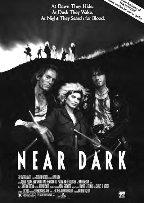 L os vampiros huyen de la luz del sol. En la mitología que se ha creado desde las primeras obras literarias protagonizadas por estos hijos de la noche este es un hecho indiscutible, la luz del sol los aniquila. Y en esta pugna entre la luz y la sombra se cifran muchas de las metáforas que rodean la figura del vampiro; la más bá sica no supera el territorio del bien y del mal, relegan do al vampiro al papel de un villano que servilmente s e opone a todo lo que tenga filiación con el bien: la vida, el amor, la familia, el orden, la ley o la libertad. Pero los vampiros de Near Dark (1987) escapan a esa dicotomía sin escala de grises. Aunque huyen de la luz, parecen cómodos transitando en sus límites, siem pre al borde del crepúsculo o del alba, persistiendo en una vida marginal y nómada que los lleva a adentrar se en el corazón rural de los Estados Unidos, donde los espacios abiertos paradójicamente los acorralan, por lo que sus guaridas son los garajes de los extramuros, sórdidos moteles de carretera o esos vehículos dise