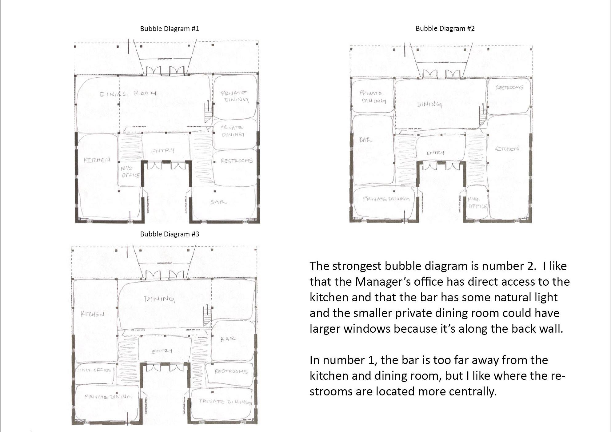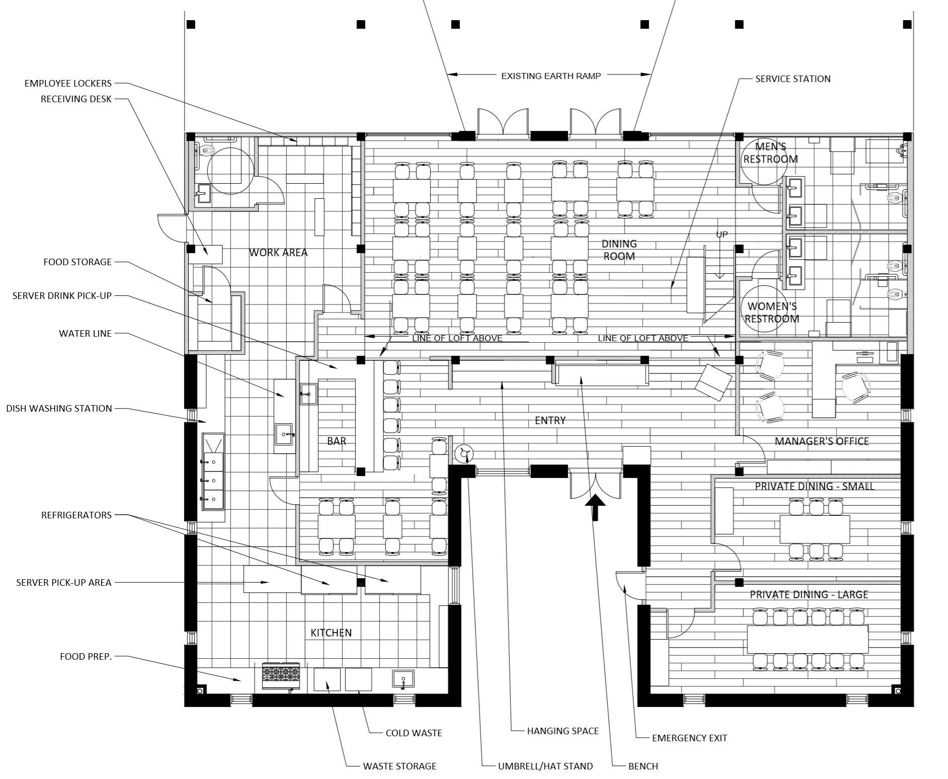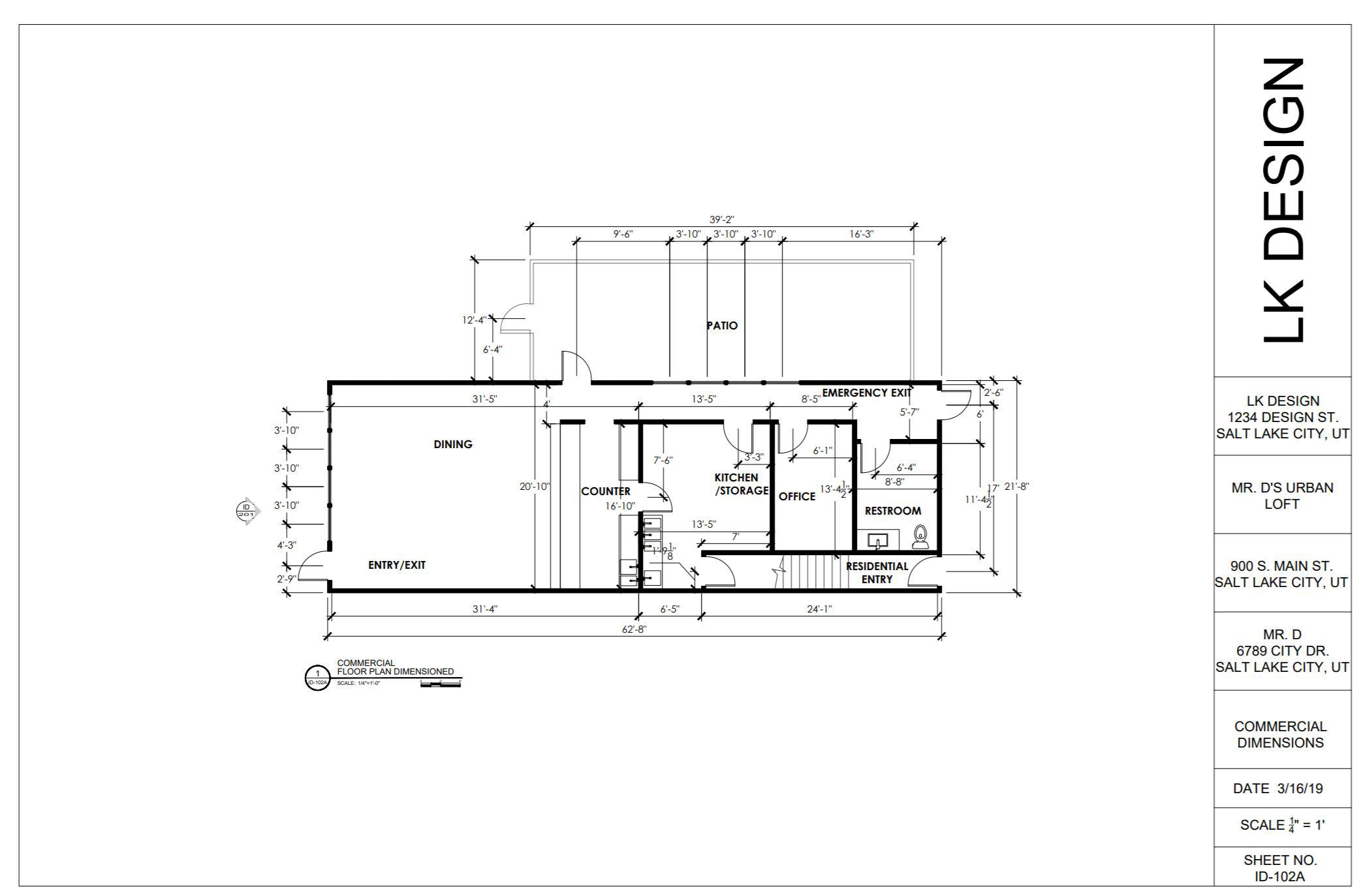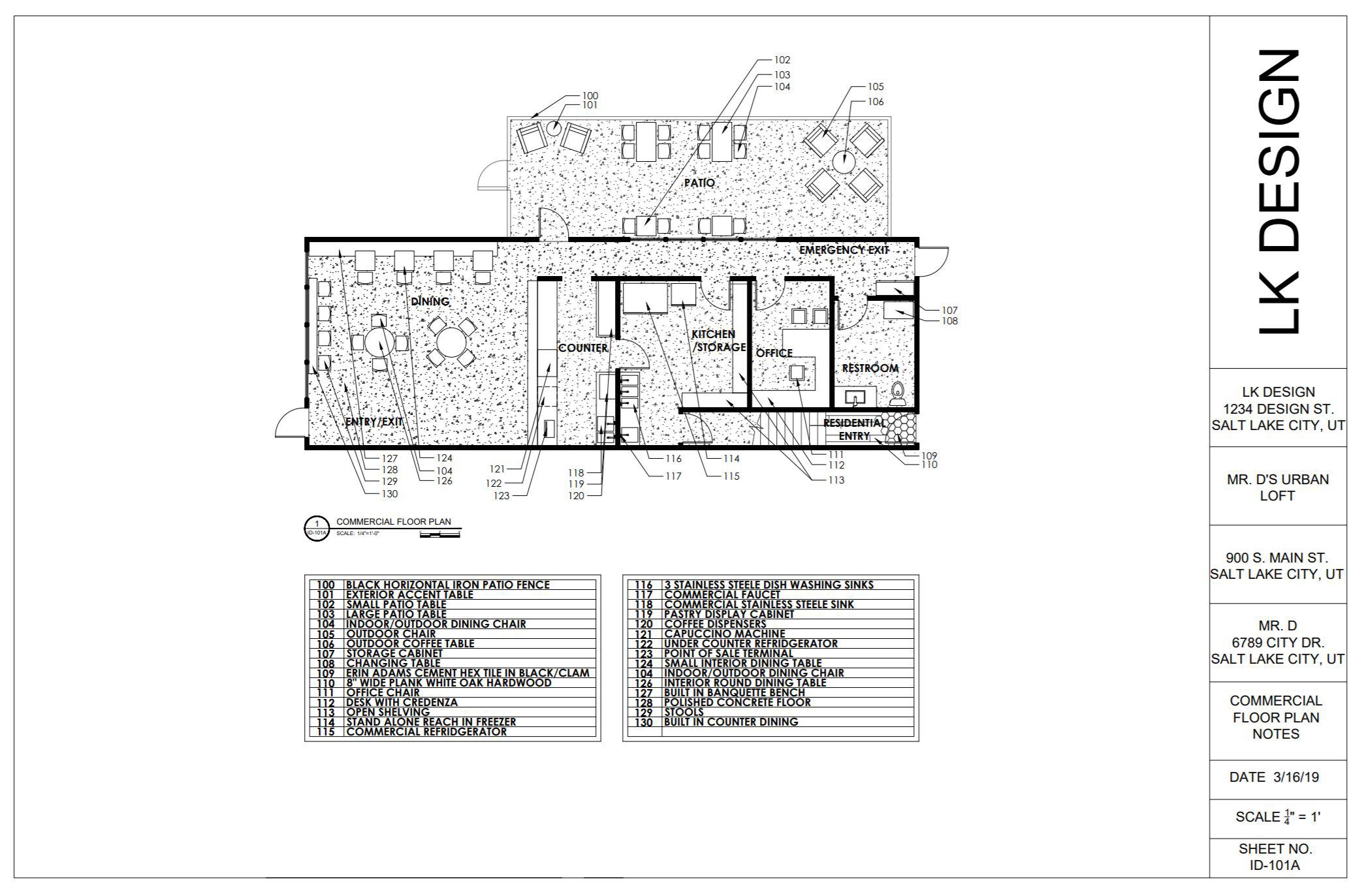 My commercial space is a coffee shop. We were to include emergency exits, accessible restrooms, and a private office. I added outdoor seating as well.