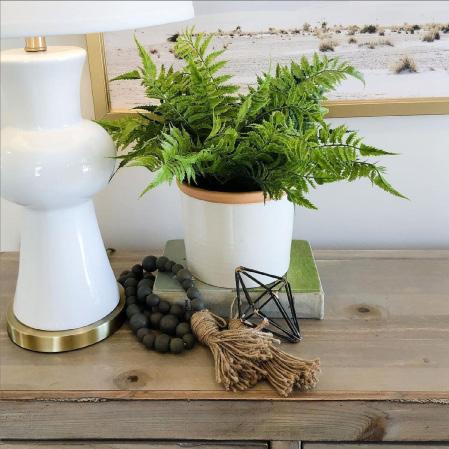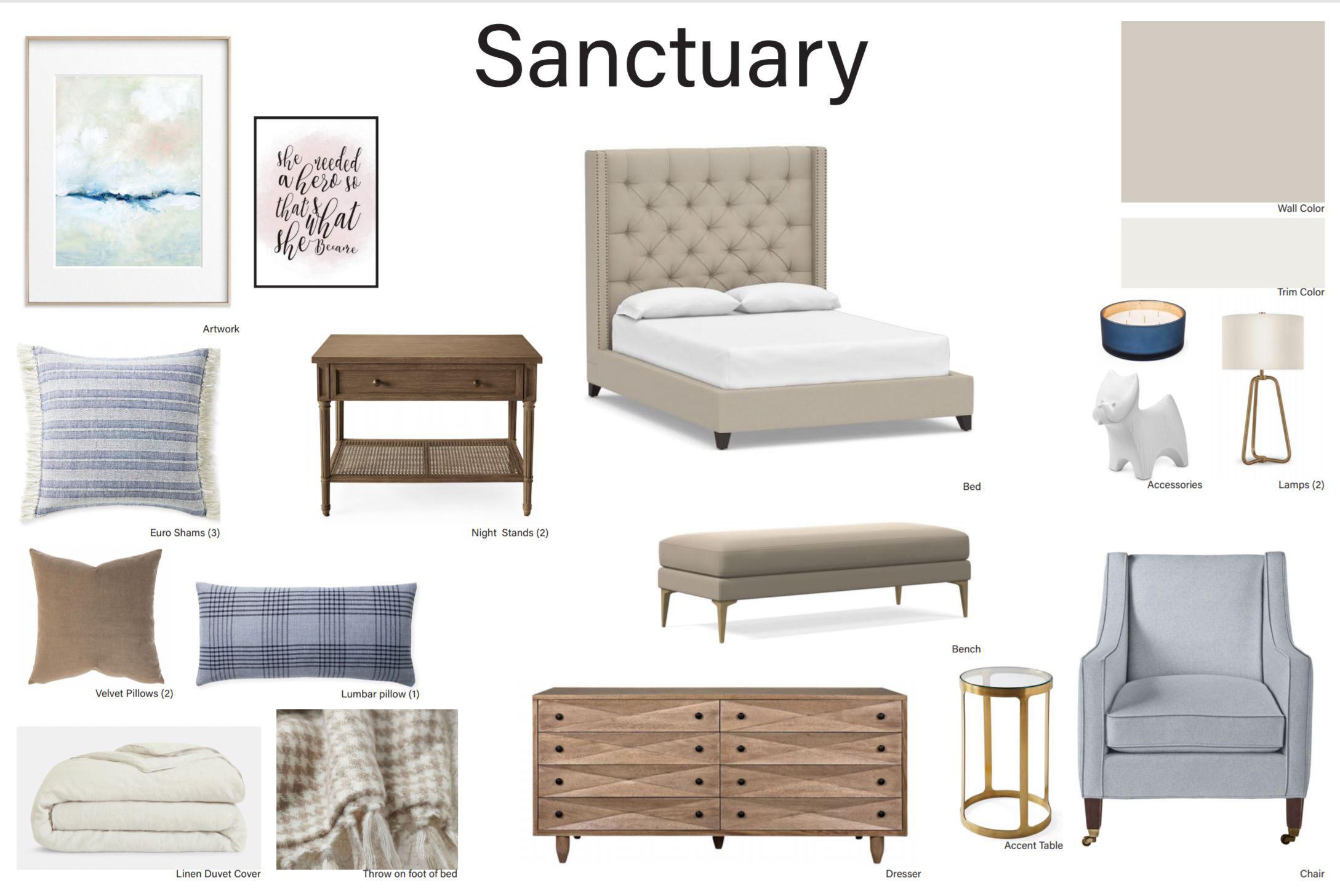 My client is already very high in wood, so I chose not to give her more of that. To help bring balance and support to my client, I gave her soothing earth tones in the paint color and wood furniture to ground her The metalic finish of the lamps, accent table, bench feet and frames and geometric patterns will add metal to support her. She has no water in her chart, so I added some watery blue toned accents. Because the South East corner represents Self Worth, I brought in an affirmation and I put a candle on the dresser in the portion of the room that falls in the South sector because it is fire. The overall feel of the bedroom will be soothing and calm to quiet her anxious and busy mind.