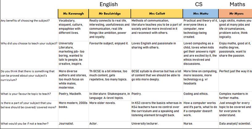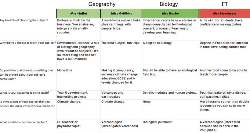 Over the last few months, I have spent time interviewing teachers around the school about their subjects and why they became a teacher. Hopefully, this will help students get to know their teachers along with their corresponding subjects better. As expected, I didn’t manage to interview every teacher, regardless I hope this still provides some insight into school life.