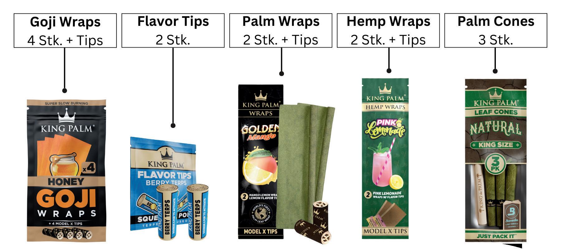 King Palm Palm Wraps with Model X Tips combine premium palm leaves with rich, coordinated flavor pairings. Each pack includes 2 flavored wraps and 2 Model X Filter tips — designed to work together for an ultra-smooth, delicious smoke.