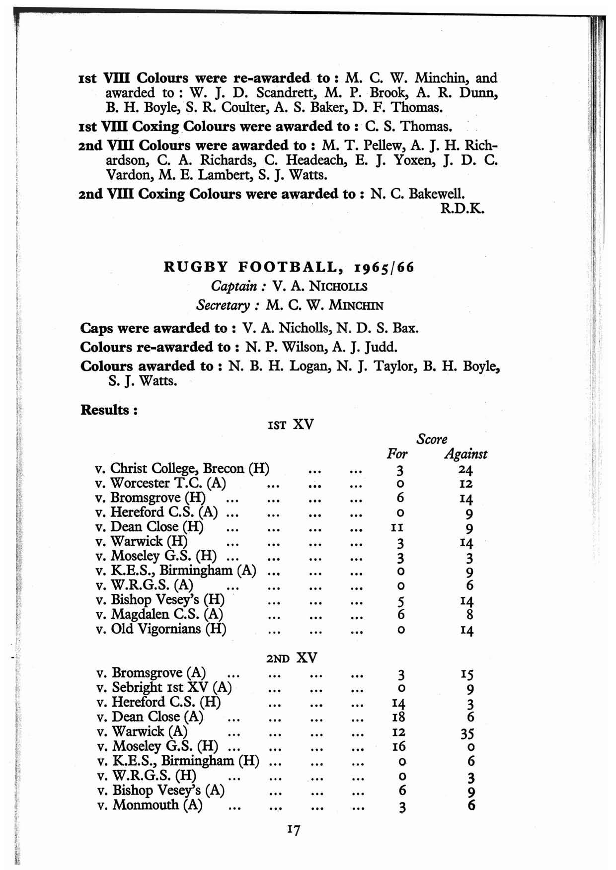 On several occasions during last Winter it seemed the pavilion extension could be cOIJlpleted ,in time for the 'cricket season ; however, ready it was, albeit with a nine inch. high water mark on the newly plastered walls. Naturally we owe a great deal to our numerous friends, and while it would be··invidious to name a few of these individuals, this report is a fitting place to record our gratitude to the Supporters' Associations of the Worcestershire and Warwickshire County Cricket Clubs, the Governors of King's School, the Old Vigornian Club and the Dean and Chapter of Worcester Cathedral. Of course the extension to the Rammell Pavilion will. serve both the School and ourselves, and therefore we were indeed fortunate that this year's President of the O.V. Club, Lt.-Col. E. R. Newcomb, M.C., should consent to officially open and then present the extension to the School. In addition to the £2,500 already raised through the. efforts of the Cricket Club, it will be necessary to collect another £1,500 in order. to complete the ablution block and we sincerely hope that many more O.V.'s will consider making a donation. Several generous members have made gi..fts in kind and of these we would especially like to mention our enthusiastic honorary aJ;chitect, Martin J ones : and the donor of a splendid commemorative·plaque now hanging inside the pavilion, A. R. Elt. In order to promote more social activity local O.V.'s, and also to raise money for the second of the project, our Social Secretaries organised several functions, the .like of which were of course impossible twelve months ago. Two well.;.attended wine and cheese parties spring readily to mind, and moreover whist was also attempted with success. A total of slightly over £200 was raised through the direct auspices of the O.V. Cricket Club Pavilion Appeal Fund during the year ; and in addition to the social events mentioned, and two profitable draws, we are most grateful to two ladies, Mesdames J. F. Dimbleby and W. G. Cullis for organising bring and buy sales ; and to Mrs J. P. Pimley for so very kindly organising the draw at the highly successful O.V. Ball in College Hall. The culminating event of the season was a splendid Dinner at the County Cricket Ground Dining Room, at which we were fortunate to enjoy.the company of our President, the Headmaster and Mrs Annett ; Mr and Mrs W. Leslie J ones of the Midland Club Cricket Conference; Mi and Mrs Dick Howorth, and many of our numerous friends and Vice-Presidents. Entertaining speeches were heard from Dick Howorth and W. Leslie Jones, while, in response, Alec Mackie thanked our guests for their kind remarks and also recounted the statistical side of the cricket season : full details being given at the end of this report. He also spoke for all playing members in thanking the ladies of the club for some magnificent teas, and in expressing gratitude to the Headmaster for his continued interest in the club and his kindness in allowing our use of the School playing fields. Our umpires, Messrs Bunn, Mackie and Norman; the scorers, Messrs Smith and Baker, and of course our very hard-working friend, Gordon Prossor, were also thanked amidst great applause.