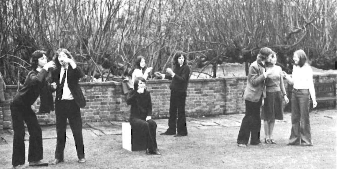 On the last Tuesday of the school year, a novelty appeared on the stage of the Old Library — namely a performance of an experimental "play" called "Fives" It consisted of six short sketches performed by six actors The opening sketch was a send-up of the worst type of pseudy production, full of significant symbolic gestures and dramatic pauses, which took place in a train A teddy-bear, reading the "Guardian", was bid for by a vicar and a mysterious man in black However, he threw himself out of the train and foiled both of them