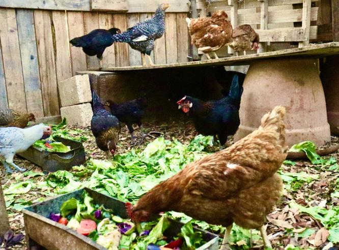 The chickens are fed a thoughtful mix of vegetables left over from the school dining hall. However, they are picky eaters and will not lay a beak near any citrus or onions.