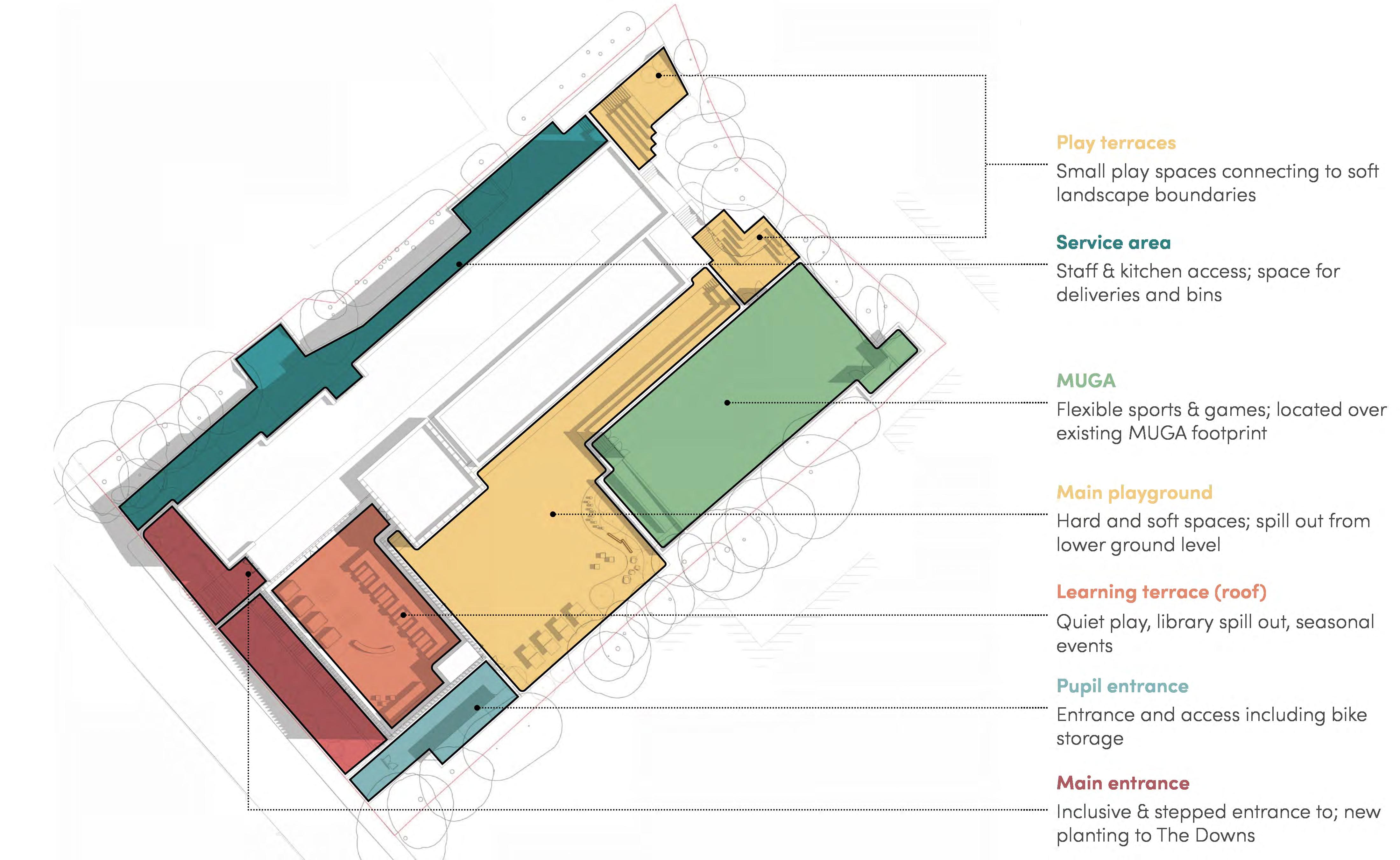 • Ensure that all site access points – vehicular, pedestrian and cyclist – come from The Downs and align with existing entrances, while minimising the impact of vehicular access by maintaining the current vehicle route along the northern boundary to safely separate deliveries and servicing from visitor and pupil areas. Provide cycle parking for the site, located to the south entrance to provide clear, safe and easy access.