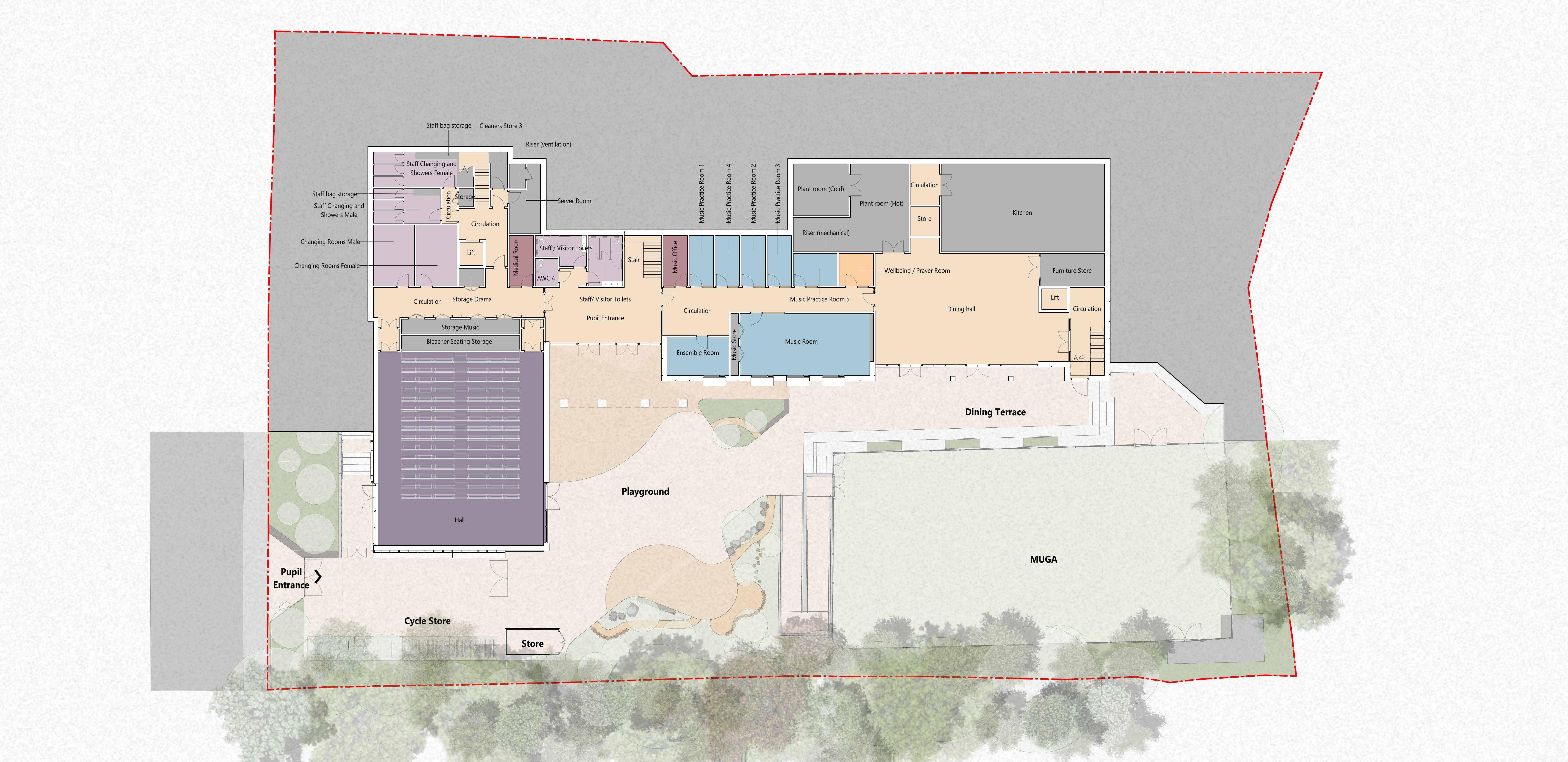 Pupils will enter via a dedicated lower-ground entrance beside the playground and cycle storage. This level features a hall space with the flexibility to accommodate performances, assemblies, talks and gatherings, as well as music rooms with practice areas and teaching spaces.