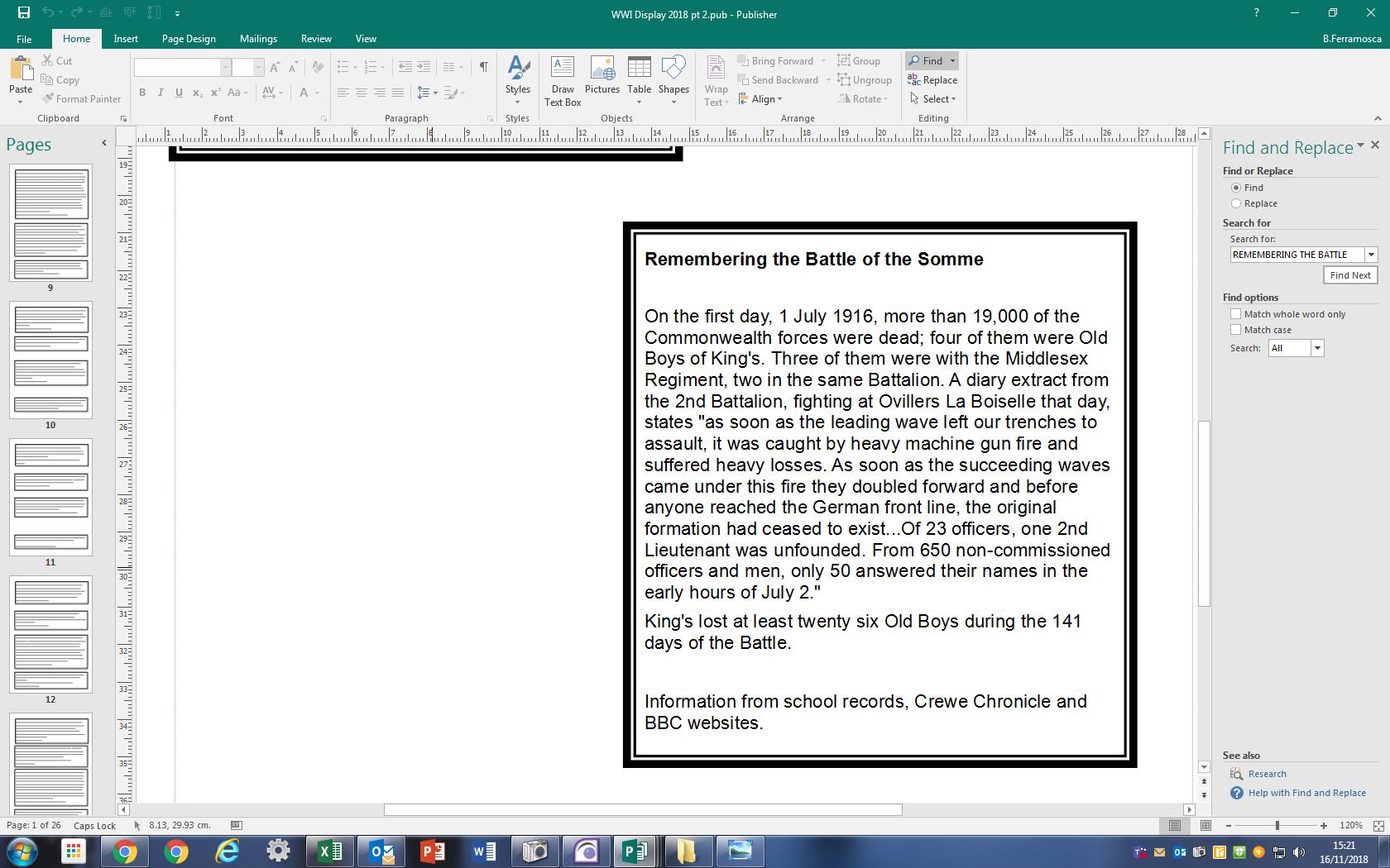 To commemorate the centenary and the creation of our library, this year the librarians have organised a special exhibition in order to give an insight into the experiences of the King’s boys during WWI, as described by them. This was the culmination of an extensive research project undertaken by the Librarian Mrs Mavin into the King’s fallen of the Great War.