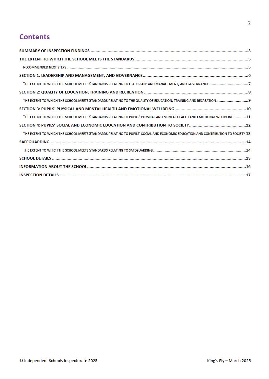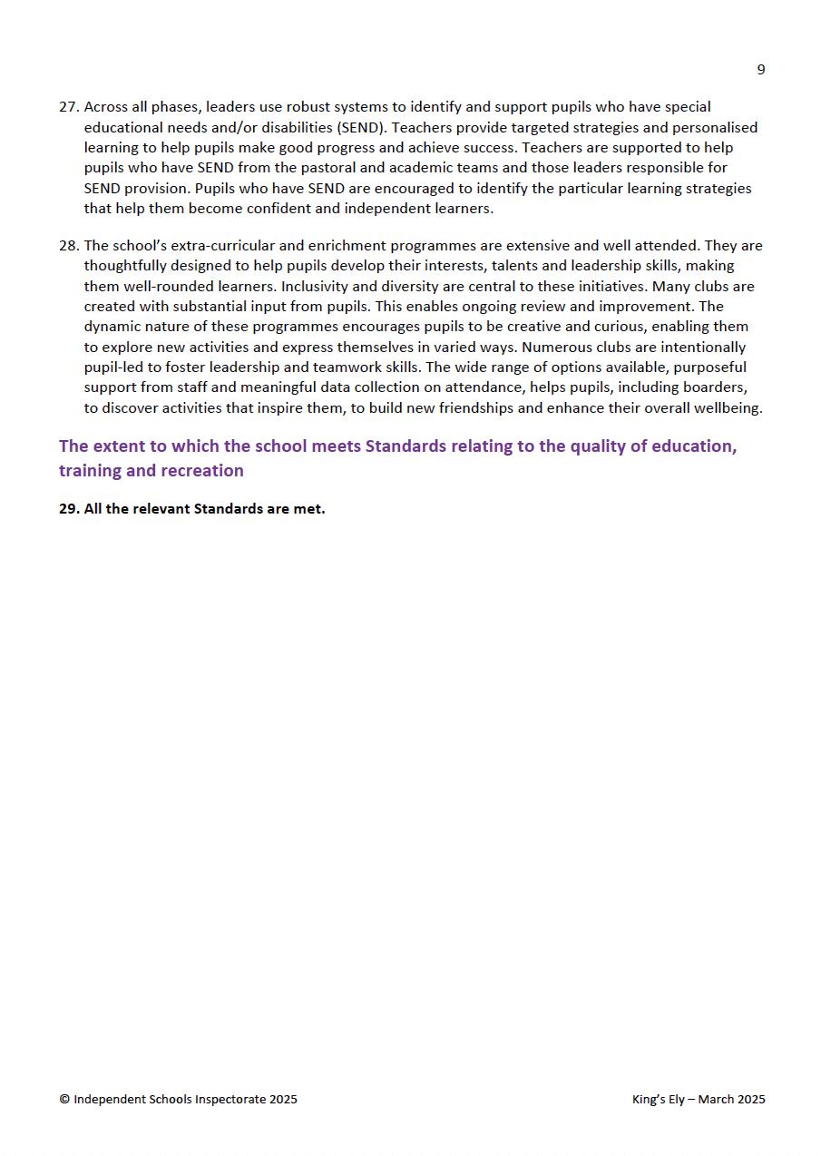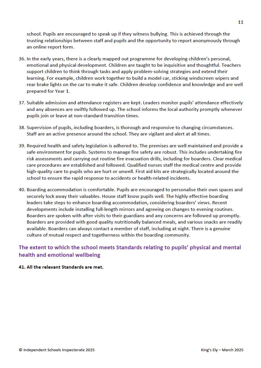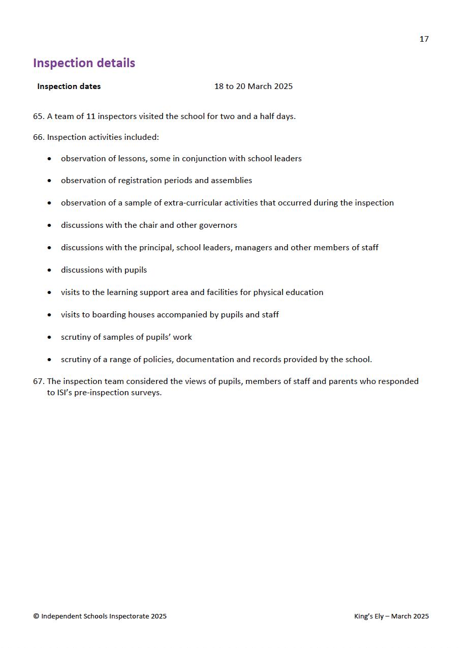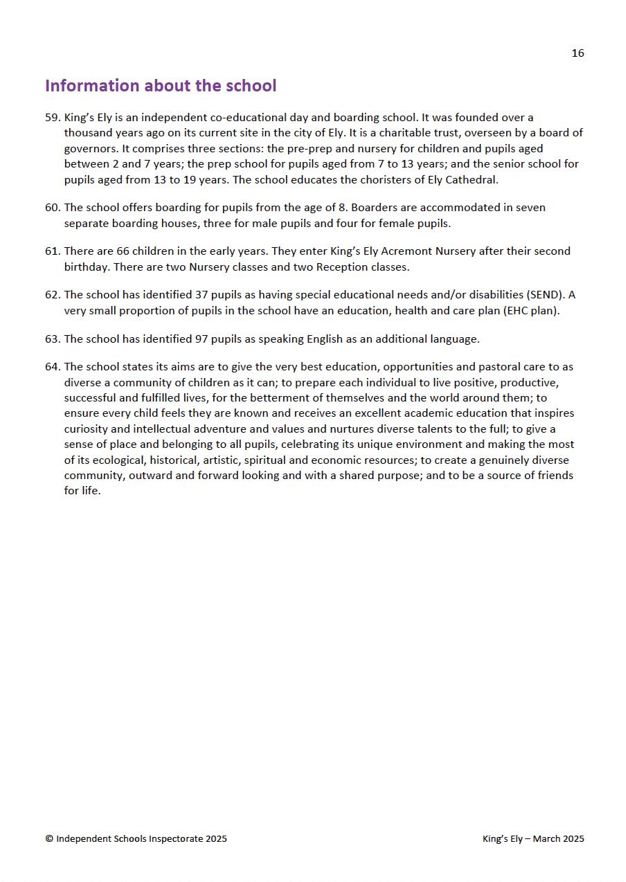 This is an exceptional achievement for the school and one which we are proud to share with the whole King’s Ely community. The full report is presented here together with some further context and information.