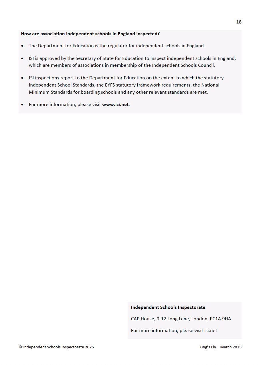 In the normal course of events we will not be inspected by ISI again for three years; however, we will continue to challenge ourselves and work with parents and pupils to ensure that King’s Ely continues to do the very best for our children into the future.