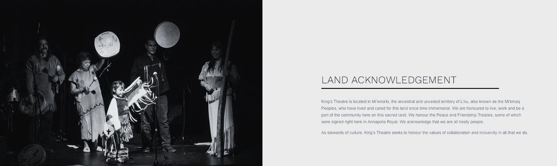 King’s Theatre is honoured to be on the ancestral and unceded territory of L’nu, also known as the Mi’kmaq Peoples, who have lived and cared for this land since time immemorial. We honour the Peace and Friendship Treaties and acknowledge that we are all treaty people.