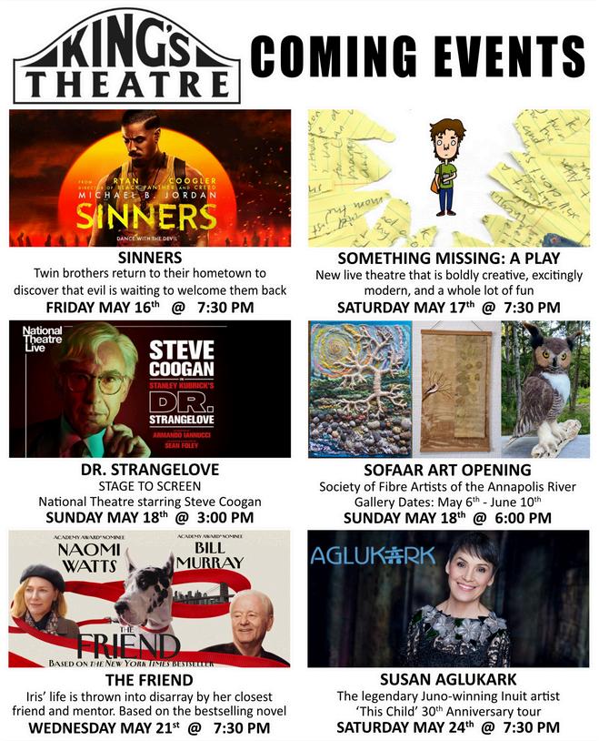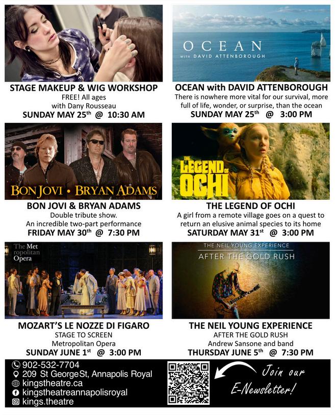 Built in 1921, King’s Theatre has been at the heart of Annapolis Royal’s cultural community for 100 years. It is a favoured venue for performers, known for its enthusiastic audiences, intimate setting, high quality production values, and warm reception from the community.
