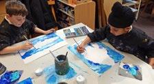 As students progressed into Year 5, they continued to advance their proportional drawing skills by creating large-scale close-ups of Greek gods and mythological creatures using chalk and charcoal. This hands-on experience helped them grasp realistic tone and texture, while their abstract projects—created while listening to Holst’s "The Planets"—allowed them to express their emotions visually. The year culminated in delicate river animals inspired by artist Helen Stanfield, where they used intricate patterns and delicate lines with expressive green and blue backgrounds to create stunning pieces.