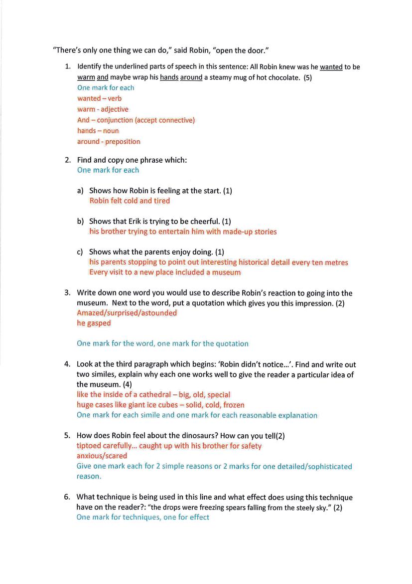 The comprehension section will test the candidate’s ability to: find and select words and phrases (they should understand how to quote from a text); identify word classes/parts of speech e.g. noun, verb, pronoun etc; explore how the writer creates effects by commenting on quotations they have selected or the effects on the reader of particular literary techniques e.g. alliteration, metaphor, simile etc. The writing section will test the candidate’s ability to write an extended piece clearly and accurately (checking spelling, punctuation, vocabulary choice, sentence structures and paragraphing). This will be a piece of descriptive writing.