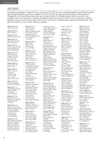 ALUMNI Participation percentages were figured for those classes from 1929-2009 who were contacted through the Annual Fund Campaign and the Alumni Phonathon as well as for members of the Class of 2015 who made special gifts in honor of their graduation. Through gifts to the Annual Fund, alumni help ensure the great benefits of a Kinkaid education that they received are also available for the current generation of students. Non-graduate alumni donors are listed with the class in which they would have graduated. A name in italics denotes a gift of $200 or more. 30% percent of Kinkaid alumni supported the Annual Fund. Their gifts of $1,006,035 set a new record. Thank you, Alumni! Class of ‘29 100% Carolyn Grant Fay Class of ‘40 50% James Isaacks Jr. Class of ‘42 50% Josephine E. Abercrombie Class of ‘44 33%