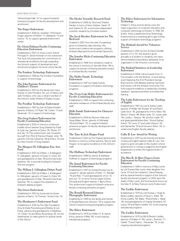 The Oveta Culp Hobby Endowment for Faculty Continuing Education Established in 1995 to support the continuing education endeavors of the Kinkaid faculty and staff.