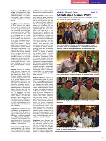 I had a nice note from Susan Lorino LaCoste. She was headed to Alaska and Vancouver for two weeks. She and her husband Bob went with two other couples. Susan is hoping to be able to make it to the next class reunion. Craig Rutten confesses that he may be having too much fun. He has turned one of his vocations into an avocation. Craig writes, “Designing true high-fidelity home audio with video systems has been a fulfilling job of mine since the ‘70s - well, not the video part until the mid ‘80s. What I’m doing now is scouring garage sales and thrift shops for ignored, quality audio equipment and returning it to the previous quality it was and then reselling it... and then telling about that adventure.” He has finished one project and has three more in the pipe-line. Craig is also doing that same thing with computers, with the help of another die-hard enthusiast - this time. Craig also reports, “We have two projects going with that side of the fun-neverstops division. My wife Glenda has a new family to support: a Yorkie and a Maltese (Bailey and Bella).” Glenda is also “finishing” the conversion of their tiny back yard into a calming refuge. Jay Jorns writes that he is a social media fool now. When not busy at JNJ Pest Control, his bug and lawn business, you can find him on Facebook: Jay Jorns and on www. facebook.com/jnjpestcontrol.com, on his YouTube channel or his blog http://katy-pestscription.com/. Jay encourages us to tune in for great bug stories and videos. He has a video called “Snap Trap in Action” that demonstrates the feeding habits of a rat. The video went viral within the pest control community. Jay says, ”Be forewarned it is violent and don’t tell PETA.” Jay has another video of Texas Leaf Cutting Ants defoliating a young Red Oak in Fulshear, Texas. He was on TV channel 2 last June when he identified a new ant in Katy called the Rasberry Crazy Ant. He also did a radio interview on Wall Street Radio. George Pierce and his lovely wife Cindy are very excited and happy for their son Allen Pierce ’07 who is engaged to Juliana Lynch, his college sweetheart. The wedding is planned for next May in Atlanta. This July it is five years since George was seriously injured in a fall. Cindy reports that George continues to hold steady and keeps a positive attitude. Our class thespian Rudy Cravens is again on the move. He is heading back to Prague in the fall to do Henry V, Troilus and Cressida and The Tro-