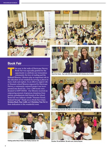 his year, in the wake of Hurricane Harvey, Book Fair was especially grateful for the opportunity to celebrate our tremendous community, the love of reading and the Kinkaid libraries. Libraries play an important role in the education of our students by serving as places to meet, study and explore. In an effort to support other Houston school libraries impacted by Hurricane Harvey, a community outreach project was incorporated into Book Fair. Over 1,000 books were donated to KIPP SHINE. Our libraries received an outpouring amount of generous donations from parents, grandparents and friends of the School. Book Fair was without a doubt “Houston Proud, Kinkaid Strong!” Thank you to Book Fair Chairs Kristen Buck, Kay Lobb and Christina Van Os for their dedication to this wonderful event.