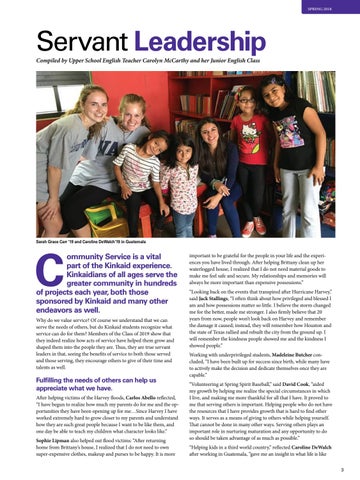 important to be grateful for the people in your life and the experiences you have lived through. After helping Brittany clean up her waterlogged house, I realized that I do not need material goods to make me feel safe and secure. My relationships and memories will always be more important than expensive possessions.” “Looking back on the events that transpired after Hurricane Harvey,” said Jack Stallings, “I often think about how privileged and blessed I am and how possessions matter so little. I believe the storm changed me for the better, made me stronger. I also firmly believe that 20 years from now, people won’t look back on Harvey and remember the damage it caused; instead, they will remember how Houston and the state of Texas rallied and rebuilt the city from the ground up. I will remember the kindness people showed me and the kindness I showed people.” Working with underprivileged students, Madeleine Butcher concluded, “I have been built up for success since birth, while many have to actively make the decision and dedicate themselves once they are capable.” “Volunteering at Spring Spirit Baseball,” said David Cook, “aided my growth by helping me realize the special circumstances in which I live, and making me more thankful for all that I have. It proved to me that serving others is important. Helping people who do not have the resources that I have provides growth that is hard to find other ways. It serves as a means of giving to others while helping yourself. That cannot be done in many other ways. Serving others plays an important role in nurturing maturation and any opportunity to do so should be taken advantage of as much as possible.” “Helping kids in a third world country,” reflected Caroline DeWalch after working in Guatemala, “gave me an insight in what life is like 3