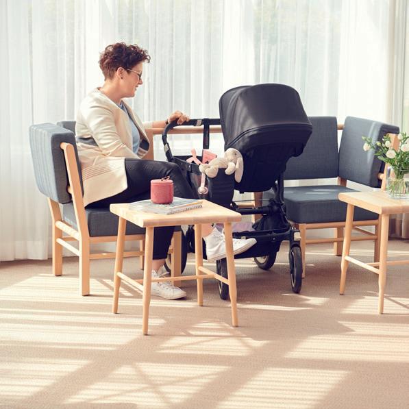 Eine Möbelfamilie mit einem einladenden, verspielten Design. Großzügige Abmessungen und klare Kontraste schaffen ein Gefühl der Sicherheit für die Nutzer*innen.