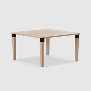 Robuster Beistelltisch aus Holz. Mehrere in Gruppen aufgestellte Tische schaffen ansprechende Bereiche, die zu spontanen Gesprächen und Besprechungen anregen.