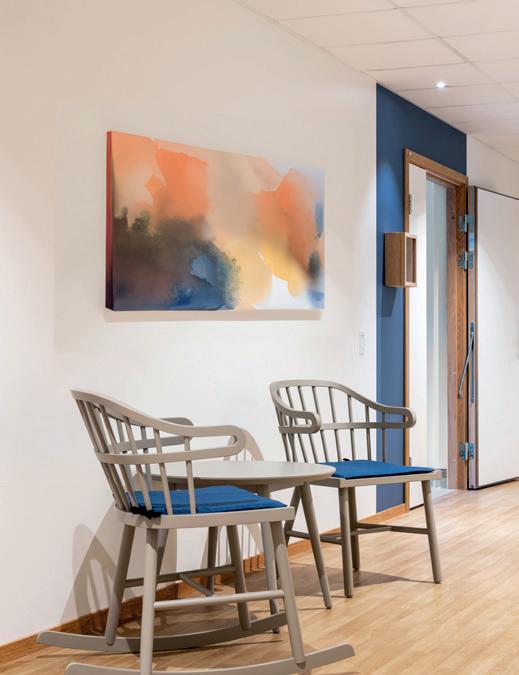 L’espace lounge ou la salle d’attente est un espace où les bénéficiaires des soins, le personnel et les proches peuvent s’asseoir avant le début d’une activité ou tout simplement s’installer et discuter. Dans cet espace important, l’aménagement intérieur crée un environnement convivial, et non pas formel, qui donne aux personnes l’envie d’y passer du temps en leur procurant un sentiment de confort et de sécurité. Une astuce consiste à compléter l’espace avec des distractions positives qui peuvent dissiper les pensées négatives, par exemple des parfums d’ambiance, des éléments visuels ou des sons.
