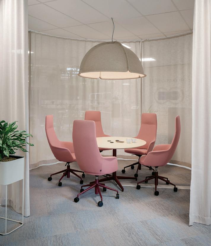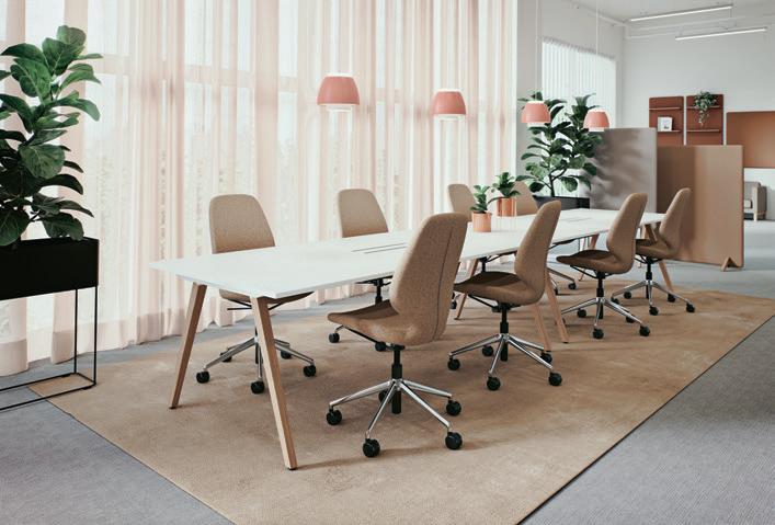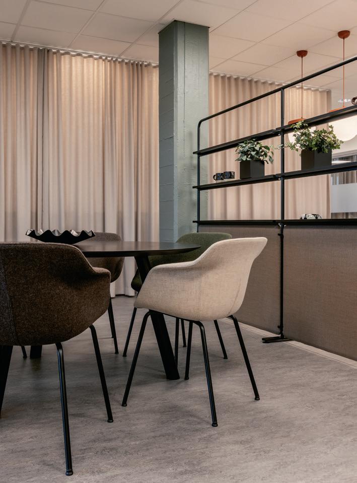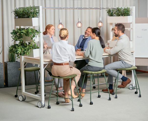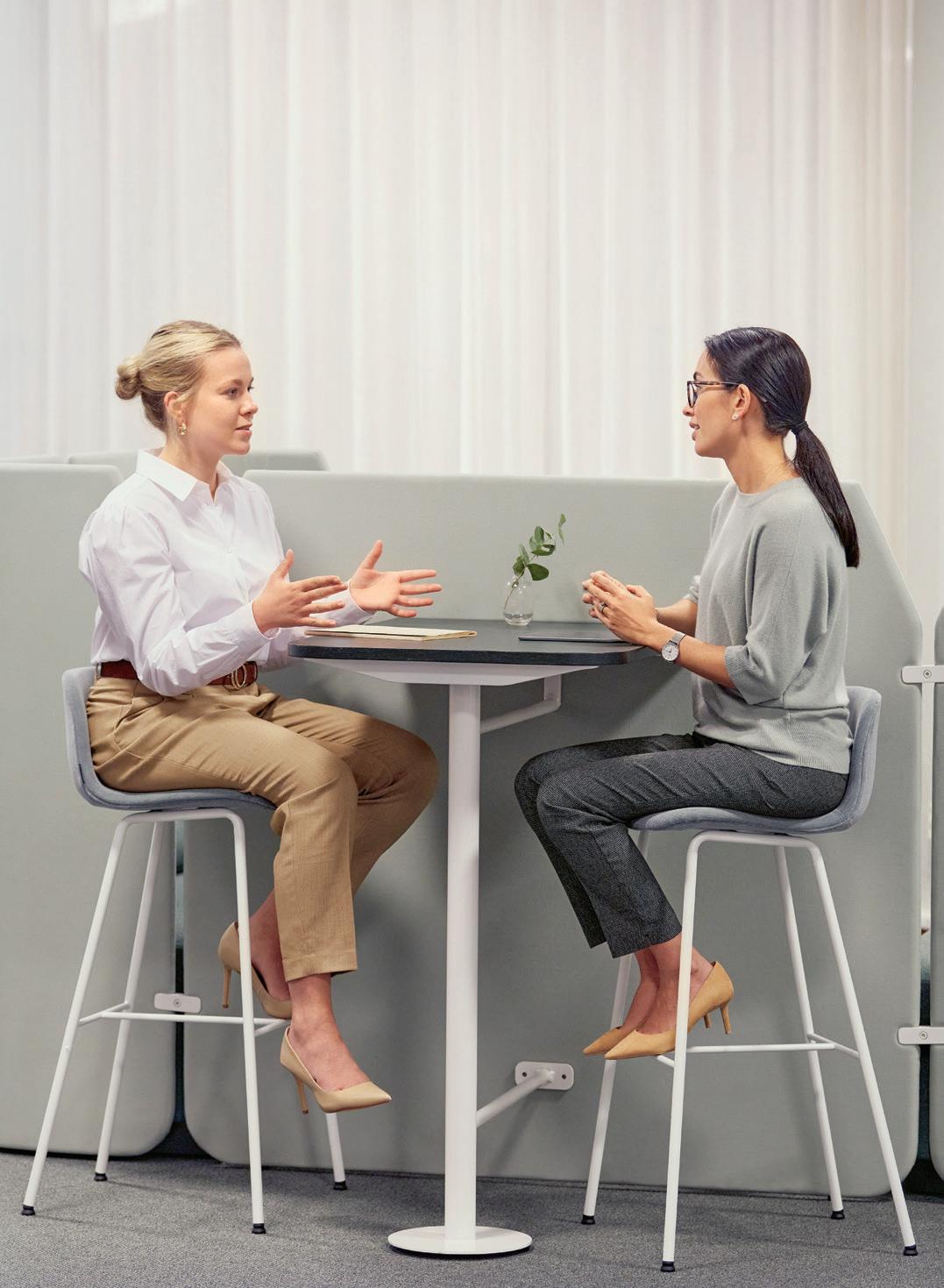 Az állítható magasságú Hal tárgyalósztal és a Plint szék megkönnyíti az ülő és álló munkahelyzetek váltakoztatását, ami különösen előnyös az aktív részvételre ösztönző megbeszéléseken.