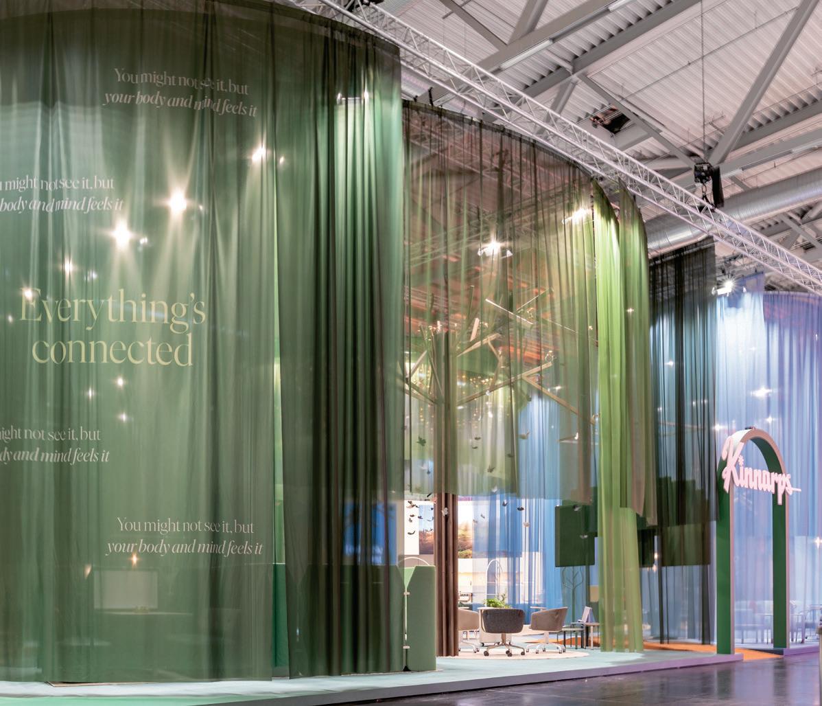 A STAND TERVEZÉSI koncepcióját a svéd természet ihlette. Részben azért, mert itt van a Kinnarps eredete és gyártása, részben pedig azért, mert a természet formáival és színeivel kialakított belsőépítészeti tervezés elősegíti a jó közérzetet. A stand három különböző szakaszát úgy tervezték, hogy egy erdei környezetet, egy tisztást és egy tengerparti környezetet jelenítsenek meg.