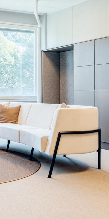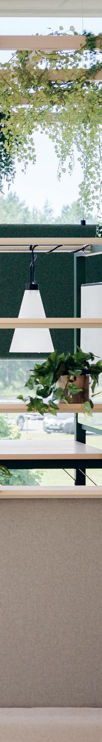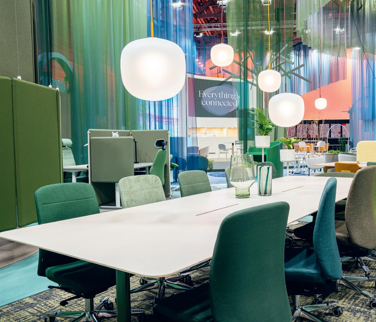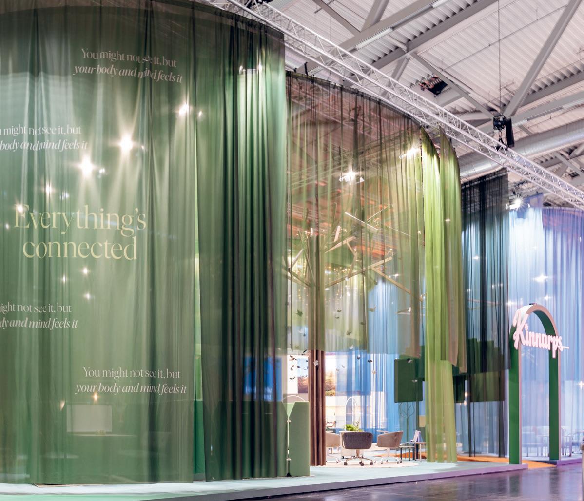 HET ONTWERPCONCEPT VOOR de stand was geïnspireerd op de Zweedse natuur. Deels omdat dit hoort bij de oorsprong en productie van Kinnarps, en deels omdat interieurontwerp met de vormen en kleuren van de natuur het welzijn bevordert. De drie verschillende delen van de stand zijn ontworpen om te lijken op een bosomgeving, een open plek in het bos en een kustomgeving.