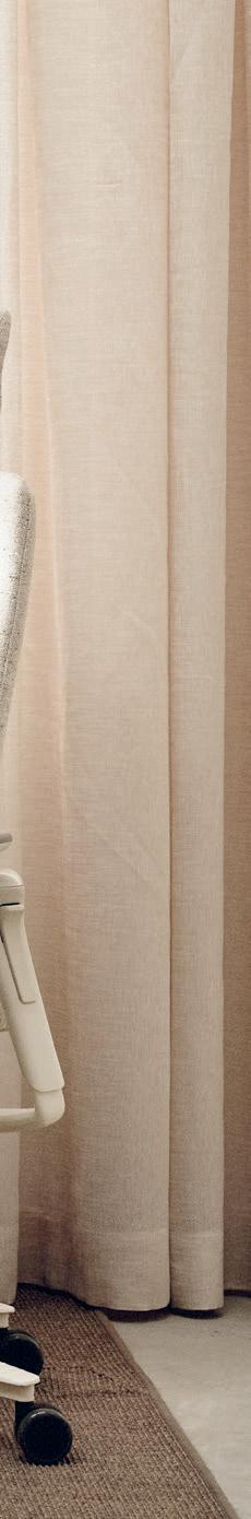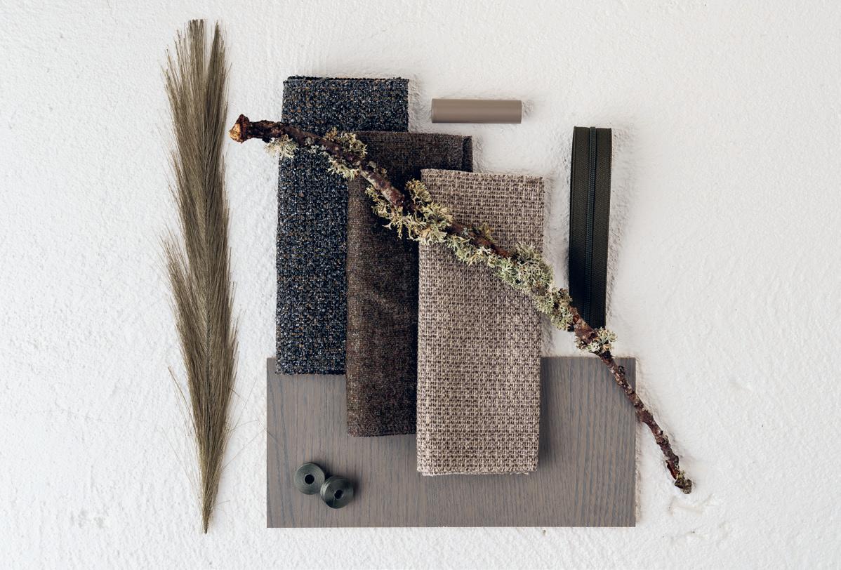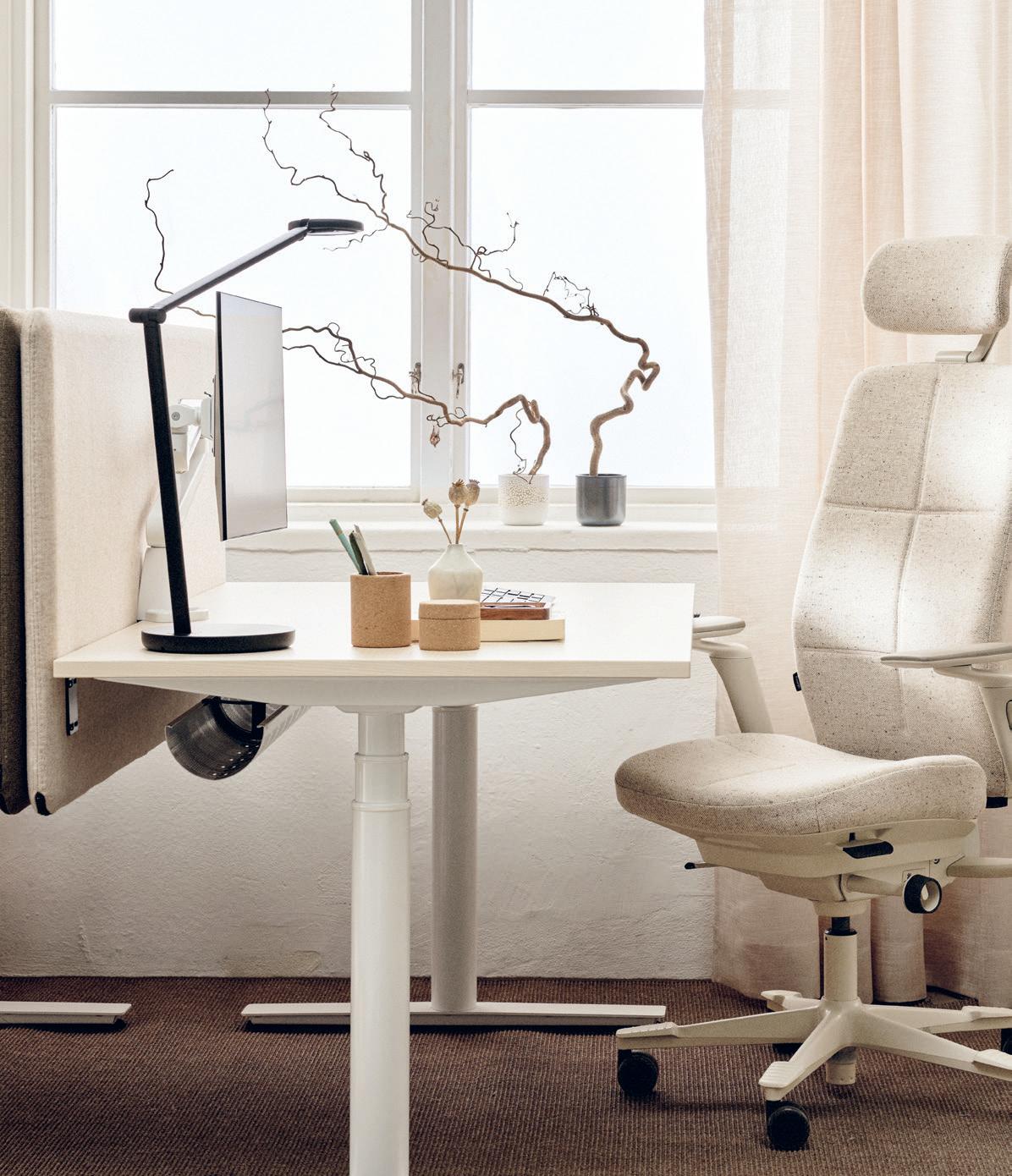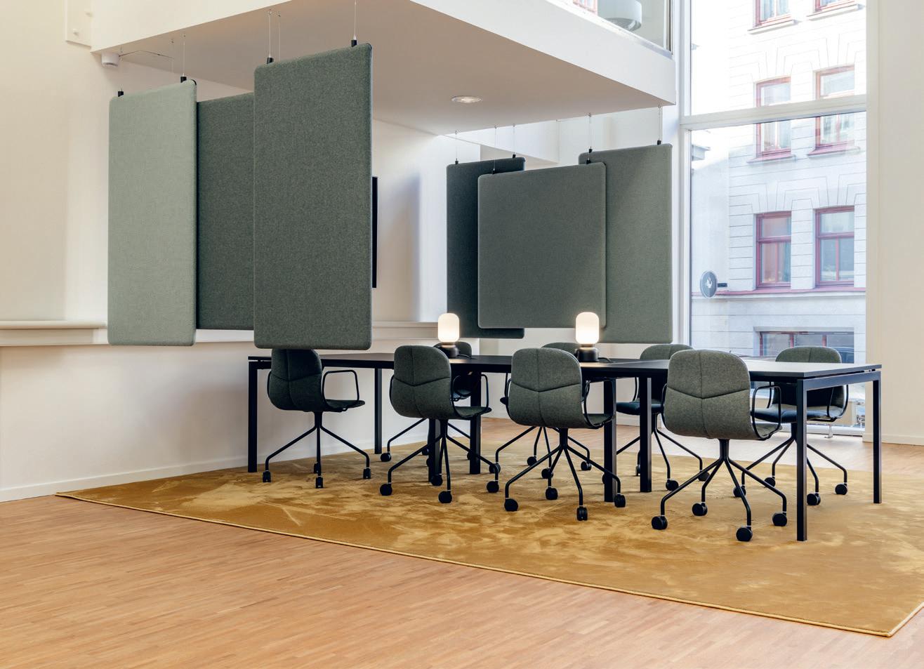 HET ONTWERPCONCEPT VOOR de stand was geïnspireerd op de Zweedse natuur. Deels omdat dit hoort bij de oorsprong en productie van Kinnarps, en deels omdat interieurontwerp met de vormen en kleuren van de natuur het welzijn bevordert. De drie verschillende delen van de stand zijn ontworpen om te lijken op een bosomgeving, een open plek in het bos en een kustomgeving.