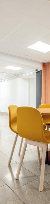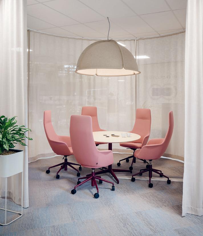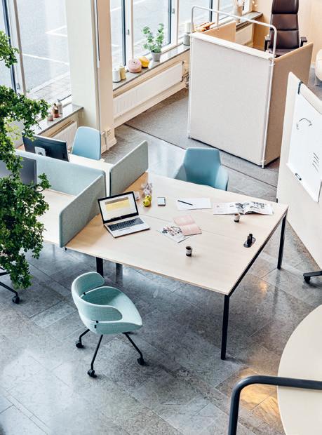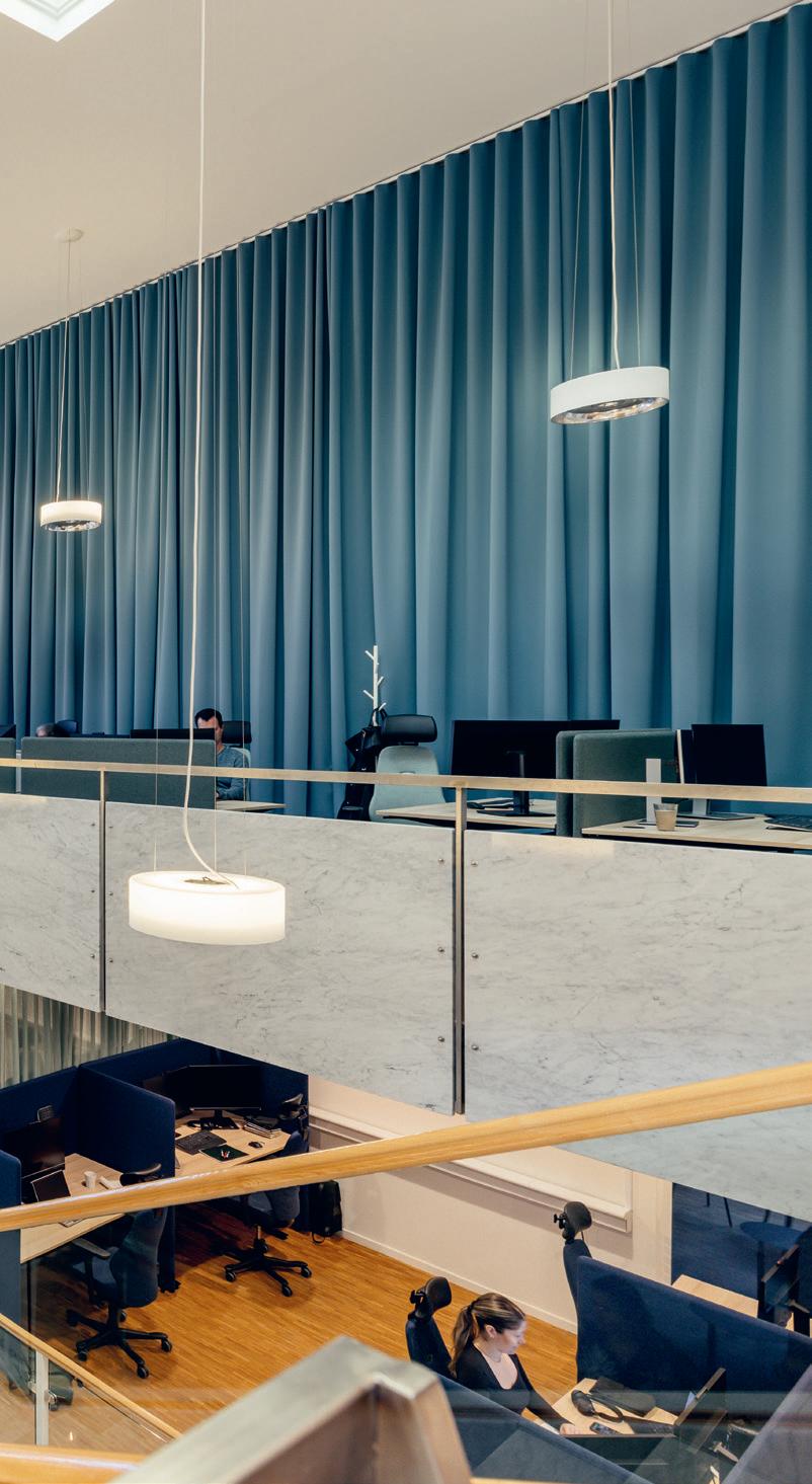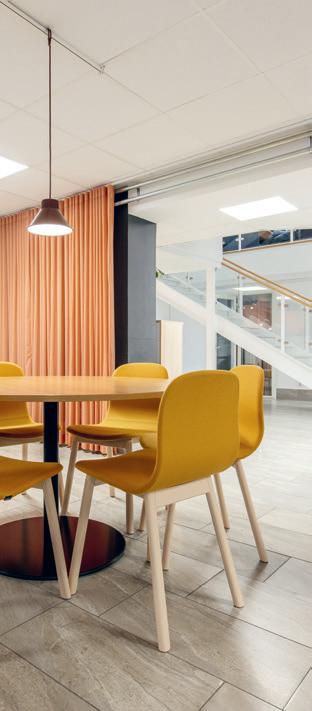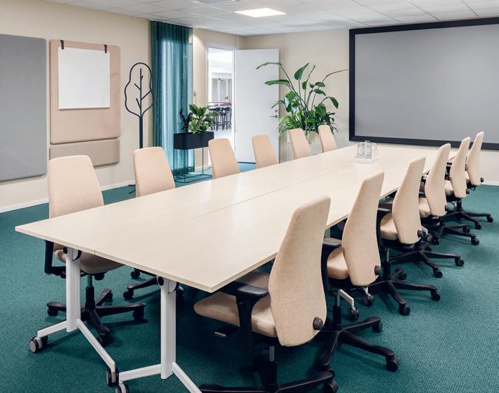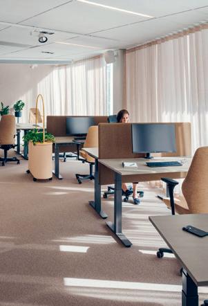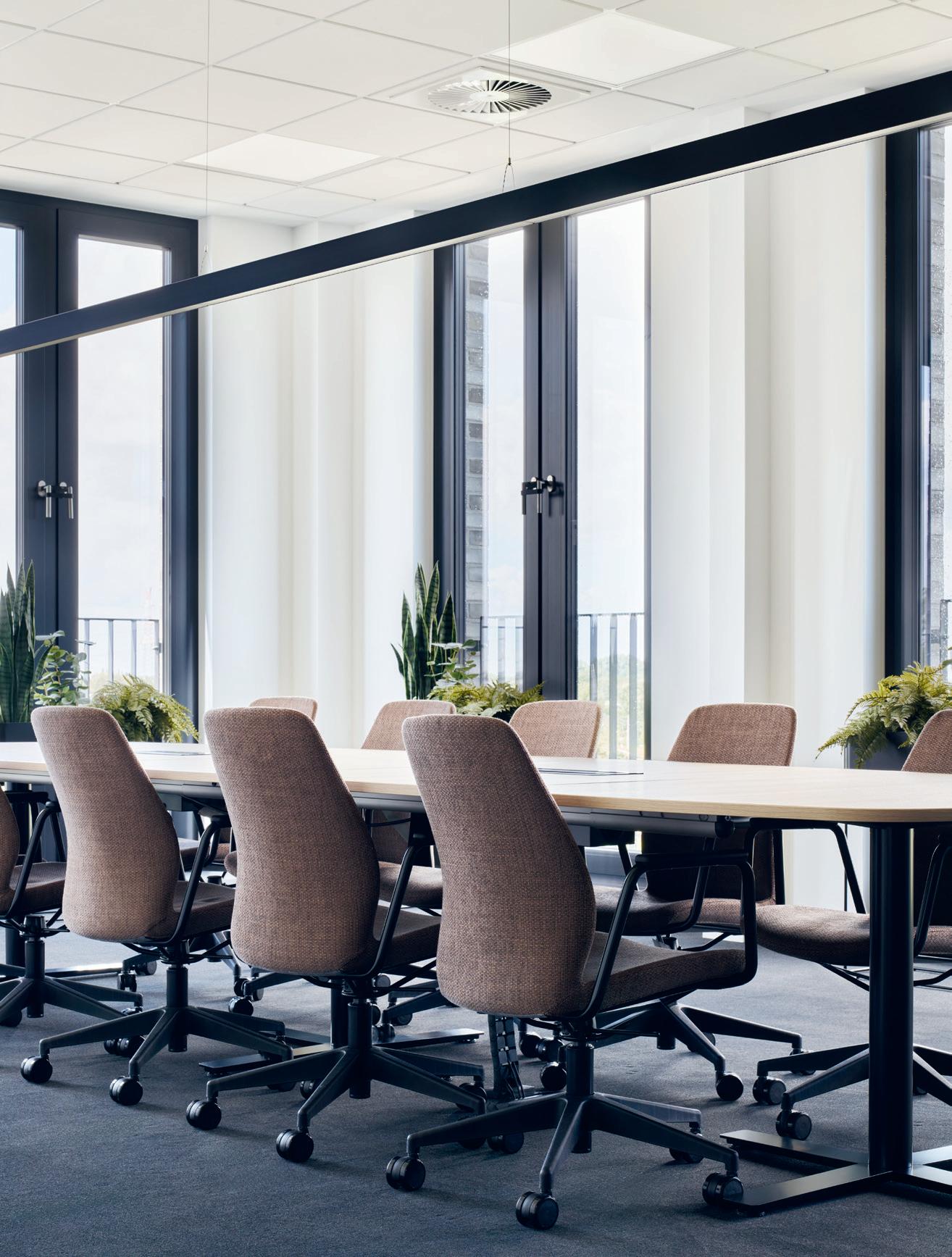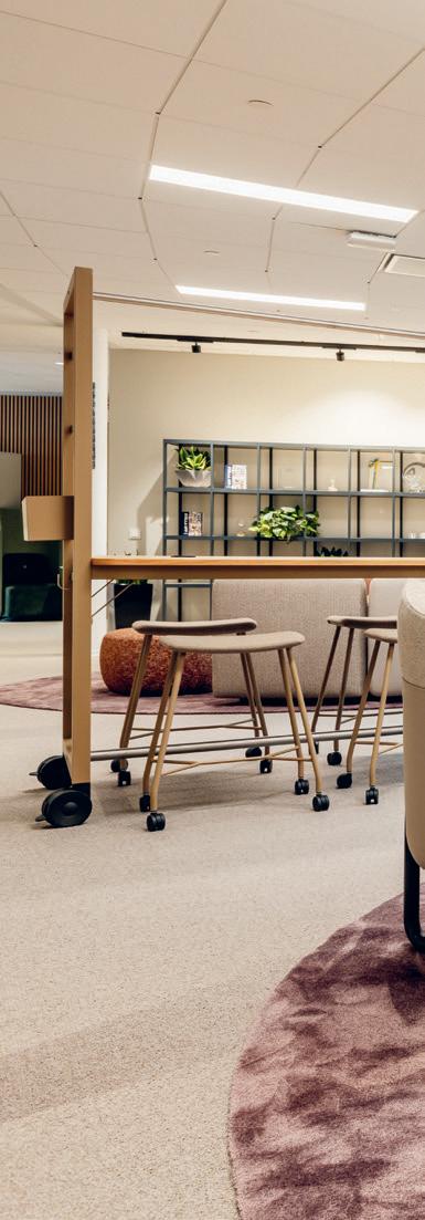 EEN BELANGRIJK TREFWOORD voor de nieuwe ruimtes was duurzaamheid, wat betekende dat het interieurontwerp van het vorige kantoor hergebruikt moest worden. Met de steun van Kinnarps werd dit op een efficiënte manier gespecificeerd en ingepland in het nieuwe interieurontwerp, zodat in wezen alles opnieuw werd gebruikt.