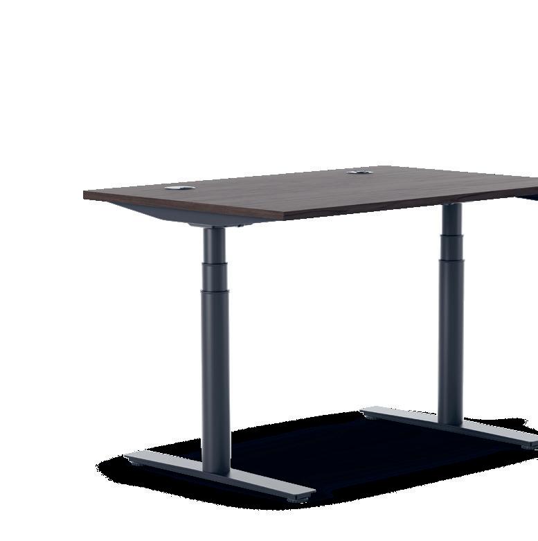 In hoogte verstelbaar bureau met vervangbaar bovenblad. Verkrijgbaar in verschillende vormen en afwerkingen.