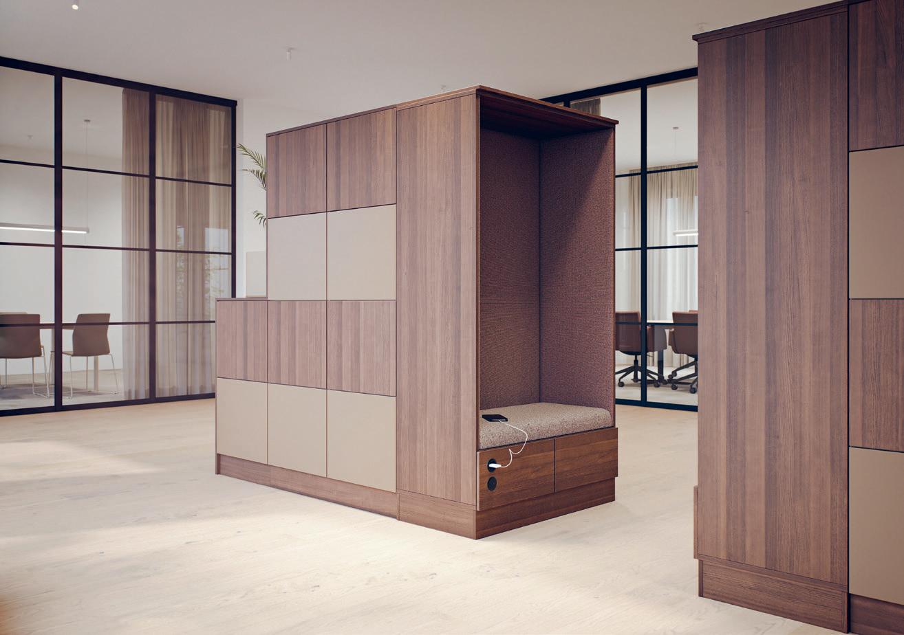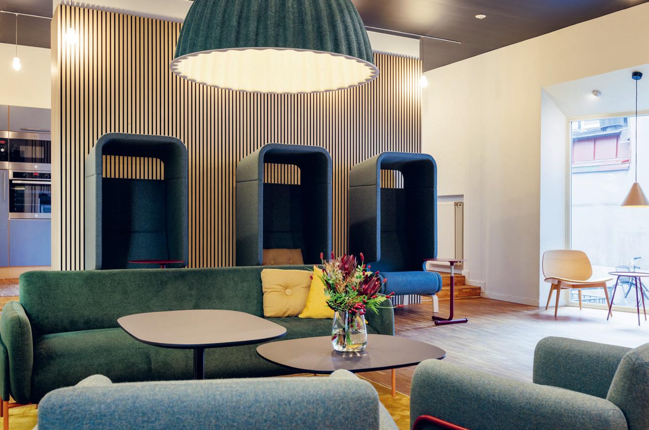 Uit de medewerkersenquête bleek dat veel mensen ook willen werken in andere ruimtes dan de traditionele werkplek. Velen wilden bijvoorbeeld op een sofa of in een fauteuil kunnen zitten en werken, in een meer informele, ontspannen omgeving. Een van de duidelijkste inzichten die uit het voorbereidende werk naar voren kwamen, was de behoefte aan ruimtes die het werk met een individuele focus ondersteunen. Daarom werd het grote aantal open werkplekken aangevuld met 19 reserveerbare werkplekken in afzonderlijke ruimtes – een optie die vaak door de medewerkers wordt geprezen. Weten dat er altijd ruimtes beschikbaar zijn, bijvoorbeeld wanneer je