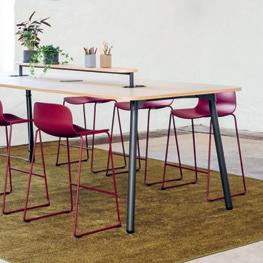 De in hoogte verstelbare Hal vergadertafel en Plint kruk maken het gemakkelijk om te variëren tussen zittende en staande werkposities, wat een voordeel is in vergaderingen waar je actieve deelname wilt stimuleren.