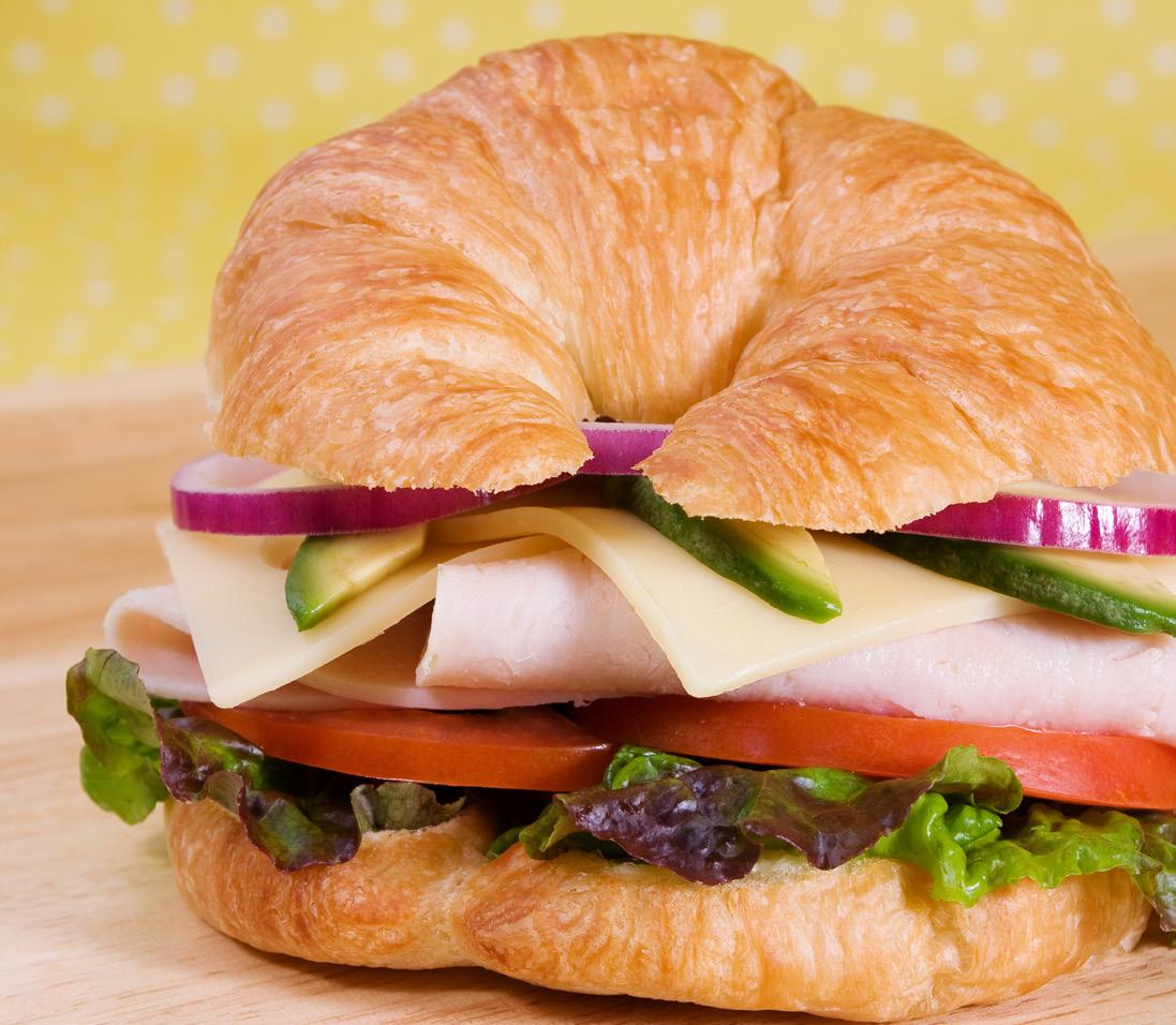 Flakey butter croissant stuffed with ham, turkey, and Swiss. Topped with bacon, lettuce, and tomato.