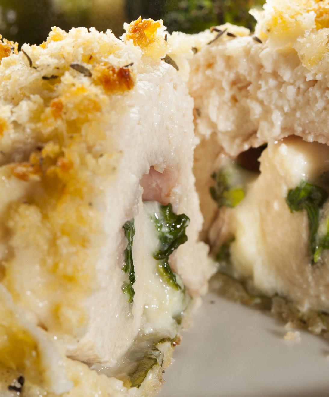 Pan-seared marinated chicken breast stuffed with three cheeses, fresh spinach, roasted garlic, and sundried tomatoes. Topped with bechamel sauce and mozzarella cheese.