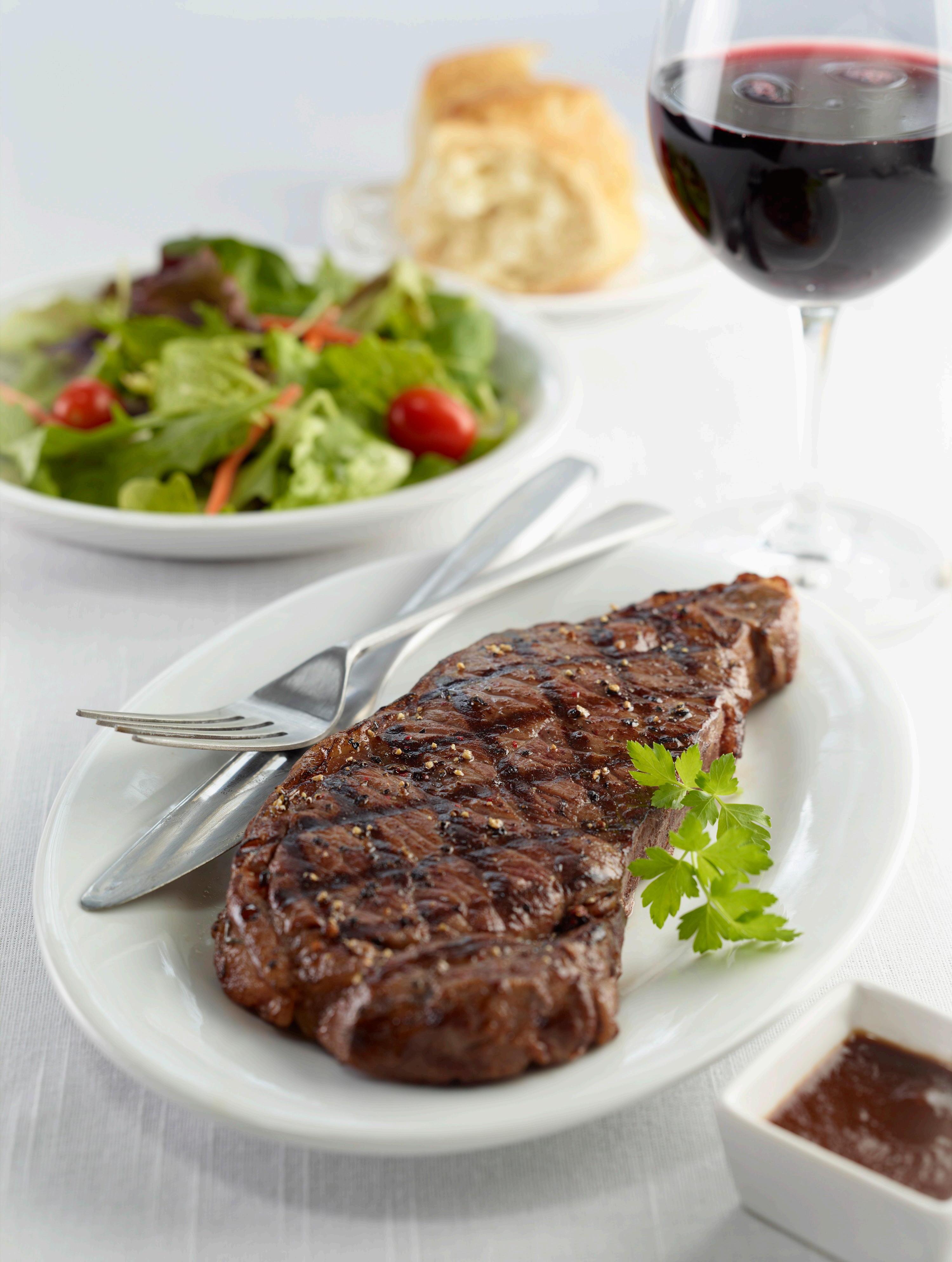 Grilled Kansas City strip, herb marinated chicken breast, and peppercorn cream sauce.