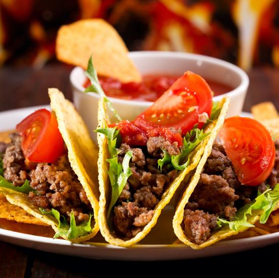 Fried Corn Shells and Flour Tortillas, Shredded Lettuce, Cheese, and Diced Tomatoes, Sour Cream, Onions, Jalapeños, Seasoned Beef and Chicken, Refried Beans, and Spanish Rice . .