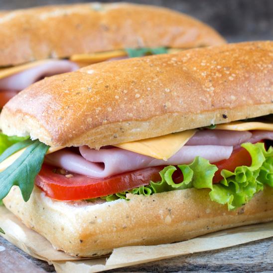 Hoagie Roll with Ham and Turkey with American & Swiss cheese, topped with Bacon, Tomatoes, and Lettuce . $14 .00