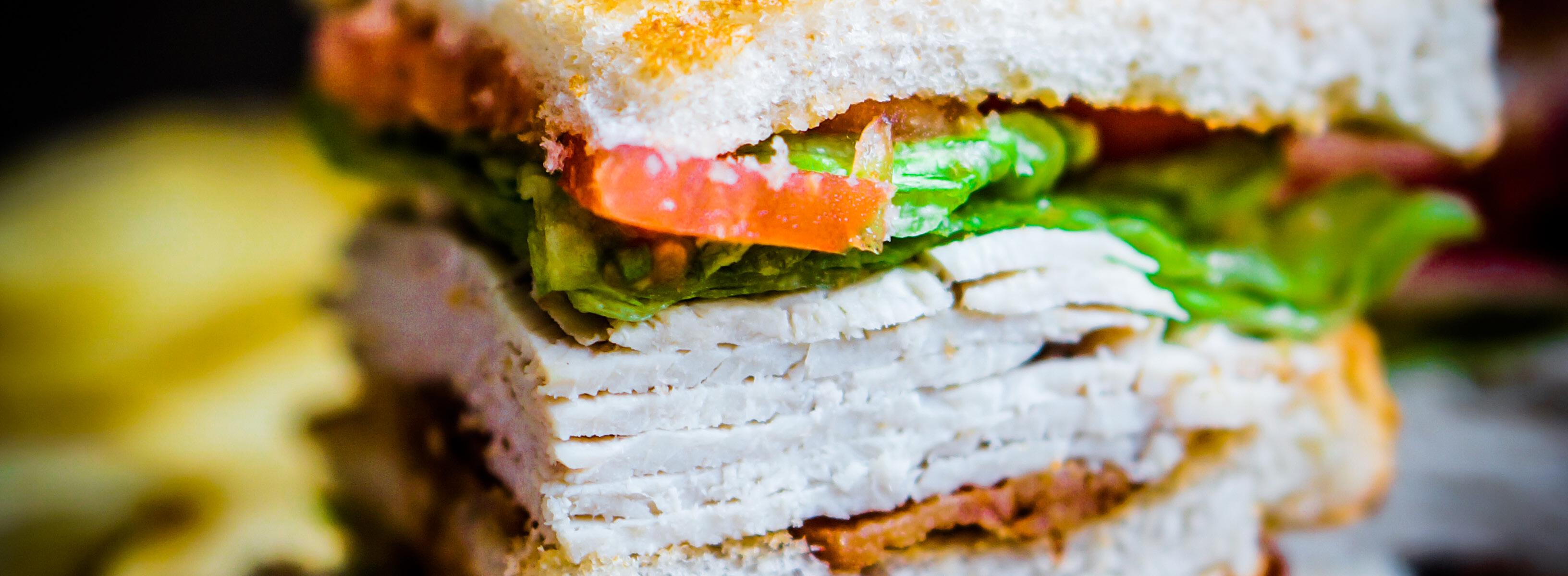 Classic double decker club sandwich with shaved turkey, lettuce, tomato, bacon, cheddar, and mayonnaise on toasted sourdough bread