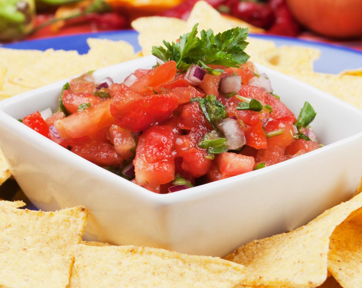 - CHIPS AND DIP: tortilla chips, salsa, queso, iced tea, and water.