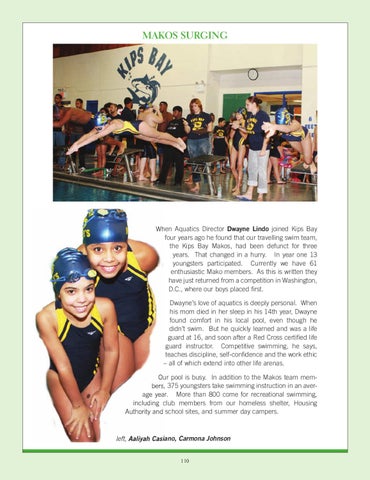 When Aquatics Director dwayne lindo joined Kips Bay four years ago he found that our travelling swim team, the Kips Bay Makos, had been defunct for three years. That changed in a hurry. In year one 13 youngsters participated. Currently we have 61 enthusiastic Mako members. As this is written they have just returned from a competition in Washington, D.C., where our boys placed first. Dwayne’s love of aquatics is deeply personal. When his mom died in her sleep in his 14th year, Dwayne found comfort in his local pool, even though he didn’t swim. But he quickly learned and was a life guard at 16, and soon after a Red Cross certified life guard instructor. Competitive swimming, he says, teaches discipline, self-confidence and the work ethic – all of which extend into other life arenas. Our pool is busy. In addition to the Makos team members, 375 youngsters take swimming instruction in an average year. More than 800 come for recreational swimming, including club members from our homeless shelter, Housing Authority and school sites, and summer day campers.