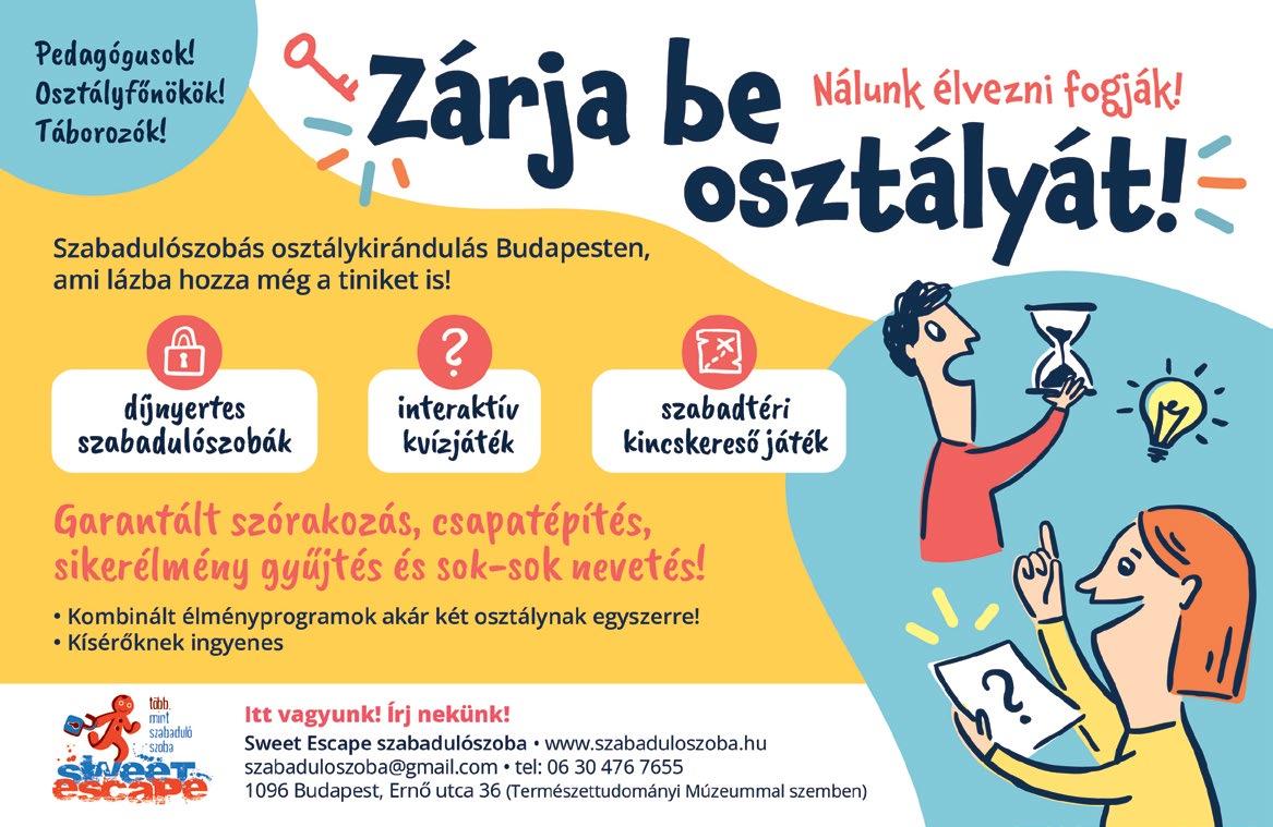 „A természet csak ad, sosem vesz el.” – vallja Szombati Orsolya, akivel a címlapinterjú keretein belül beszéltünk munkáról, életvitelről, elvárásokról, betegségről, újrakezdésről, bátorságról és elégedettségről. A természet talán ősszel mutatja a legszebb arcát, kánikuláktól és hőhullámoktól mentesen. Zárkózik már ugyan a természet, de a legpompásabb színekben teszi mindezt. Ilyenkor érdemes nyakunkba venni az országot, na meg az osztályt és elindulni. Ki a természetbe. Kiváló úti cél lehet Győr, ahol az év minden napján, sokszínű és változatos programokkal várják az osztálykirándulókat beltéren és a szabadban egyaránt. Csodaszép város, páratlan milliő, felejthetetlen élmények. Plusz súgok egy tippet: érdemes felkeresni Győrt adventkor is, káprázatos lesz.