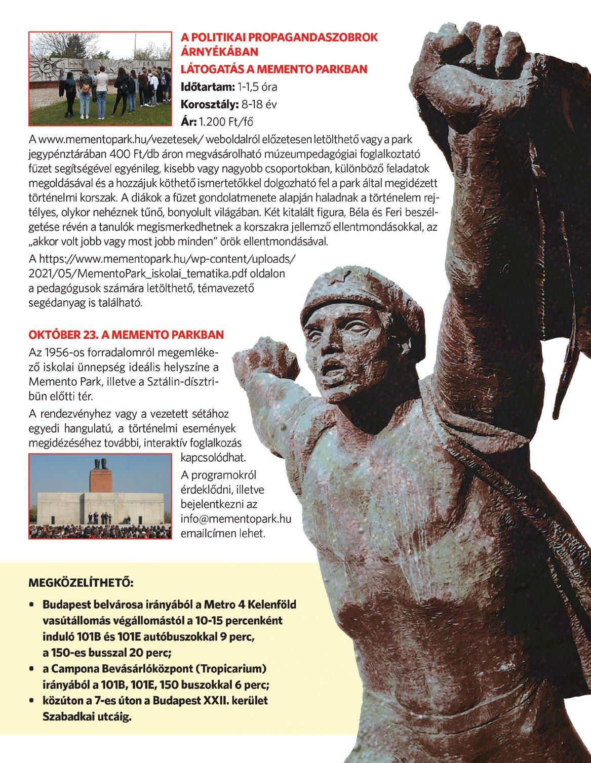 A Memento Park Közép-Eu rópa első olyan tematikus létesítménye, amely egy diktatúrára és annak buká sára emlékeztet. A Park Budapest különleges, egyedi látványossága. A Szoborpark Múzeum, a Barakk Mozi, a Fotókiál lítás, a Sztálin Dísztribün és a Raktártárlat komplex élményt kínál minden korosztálynak. A környék látnivalóival kombinálva kel lemes szabadidős célállomás és kirándulóhely is egyben.