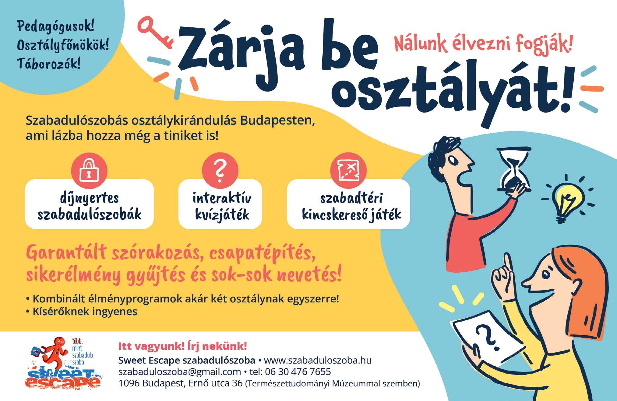 Aszabadulószobák nemcsak izgalmas kihívást jelentenek, hanem csapatépítő és logikai készségeket is fejlesztenek. A diákoknak össze kell dolgozniuk, kreatívan kell gondolkodniuk és problémákat kell megoldaniuk, hogy kijussanak a szobából adott időn belül. Budapest rengeteg különböző tematikájú szabadulószobát kínál, így minden osztály megtalálhatja a hozzá leginkább illőt!